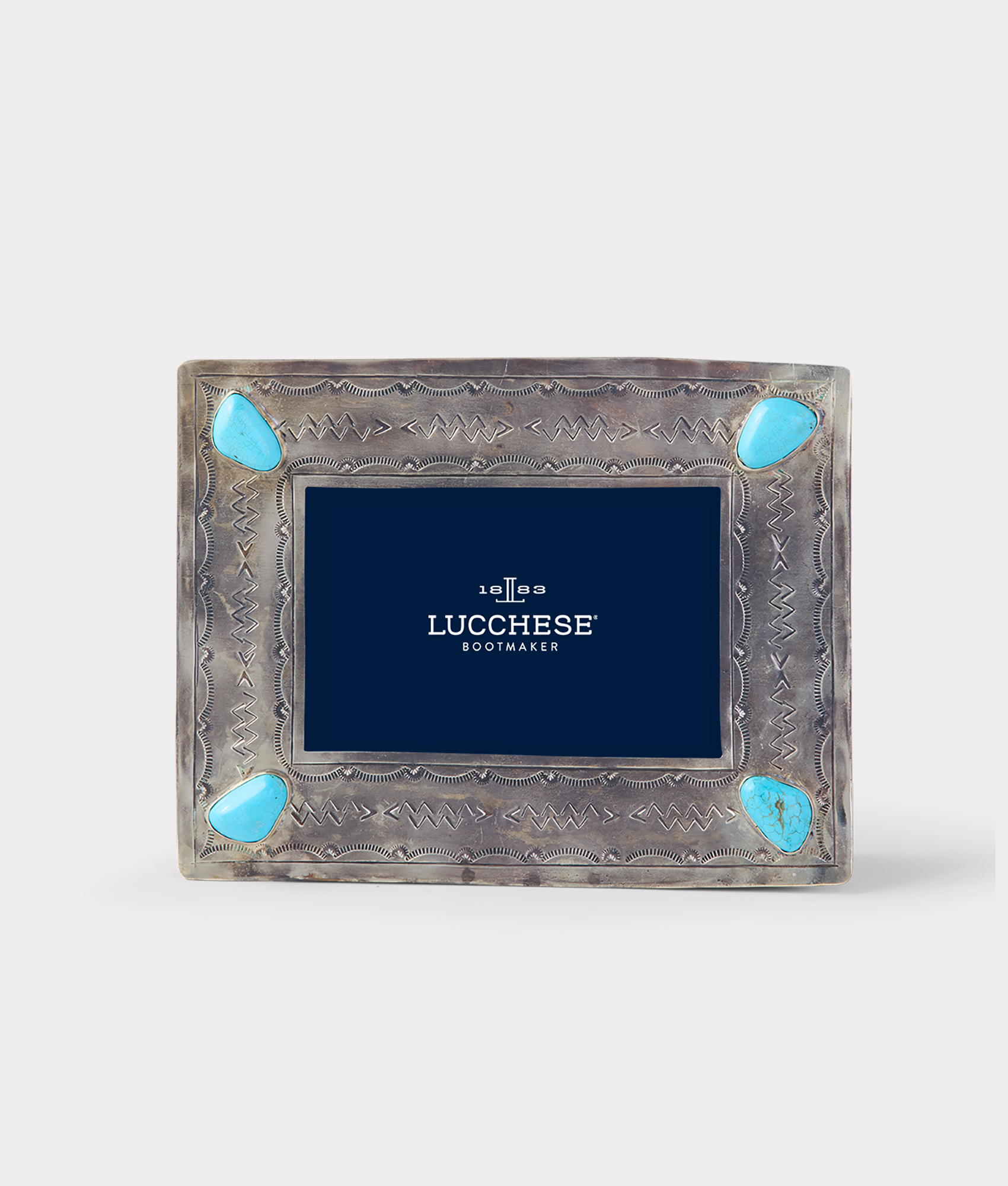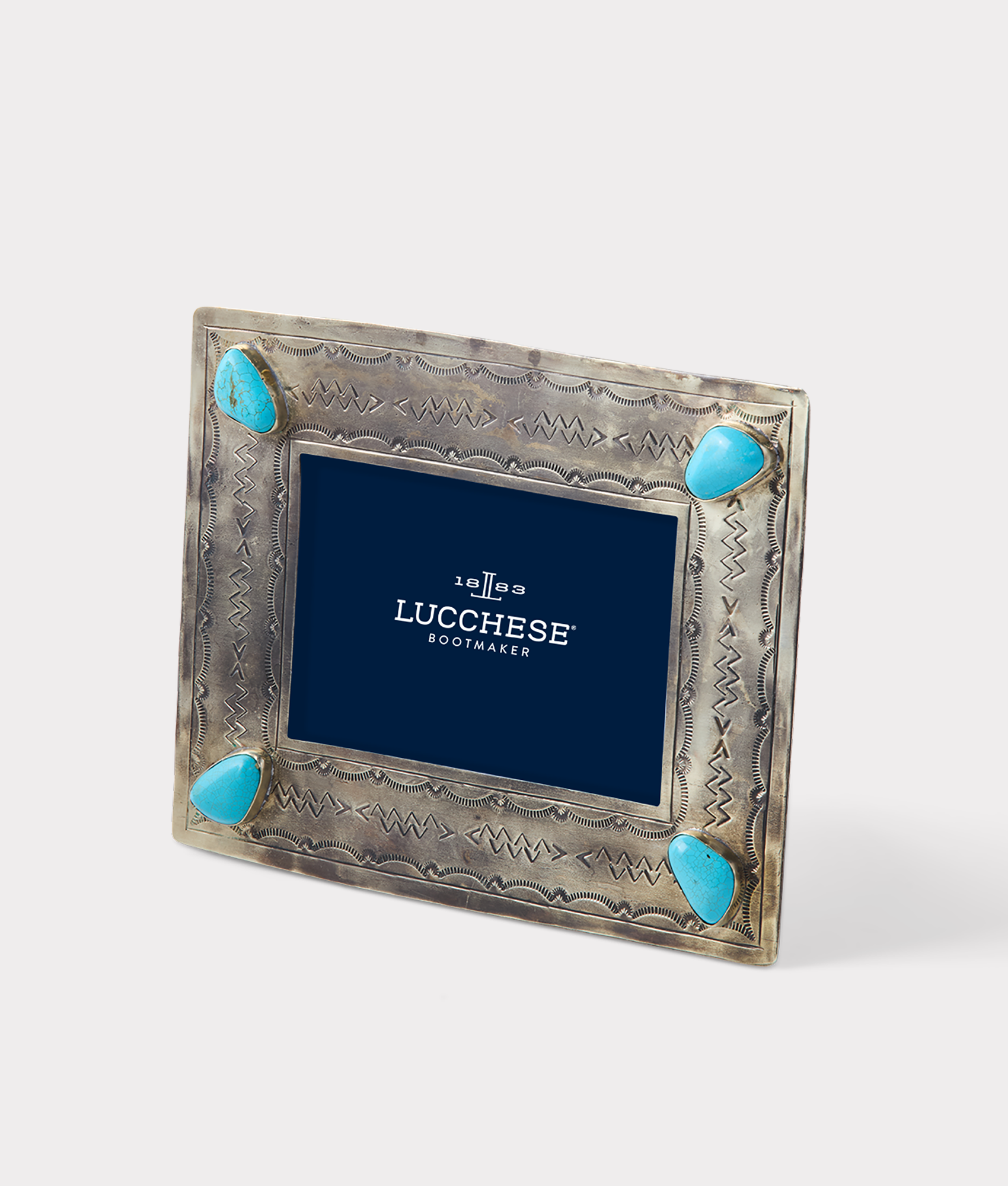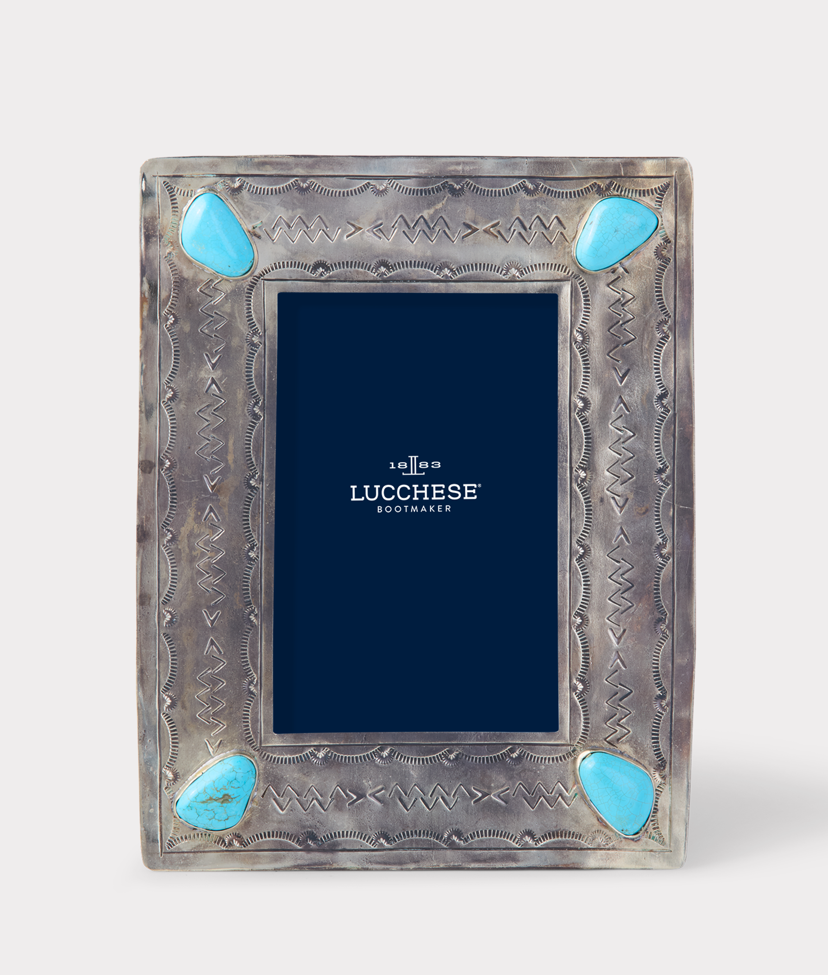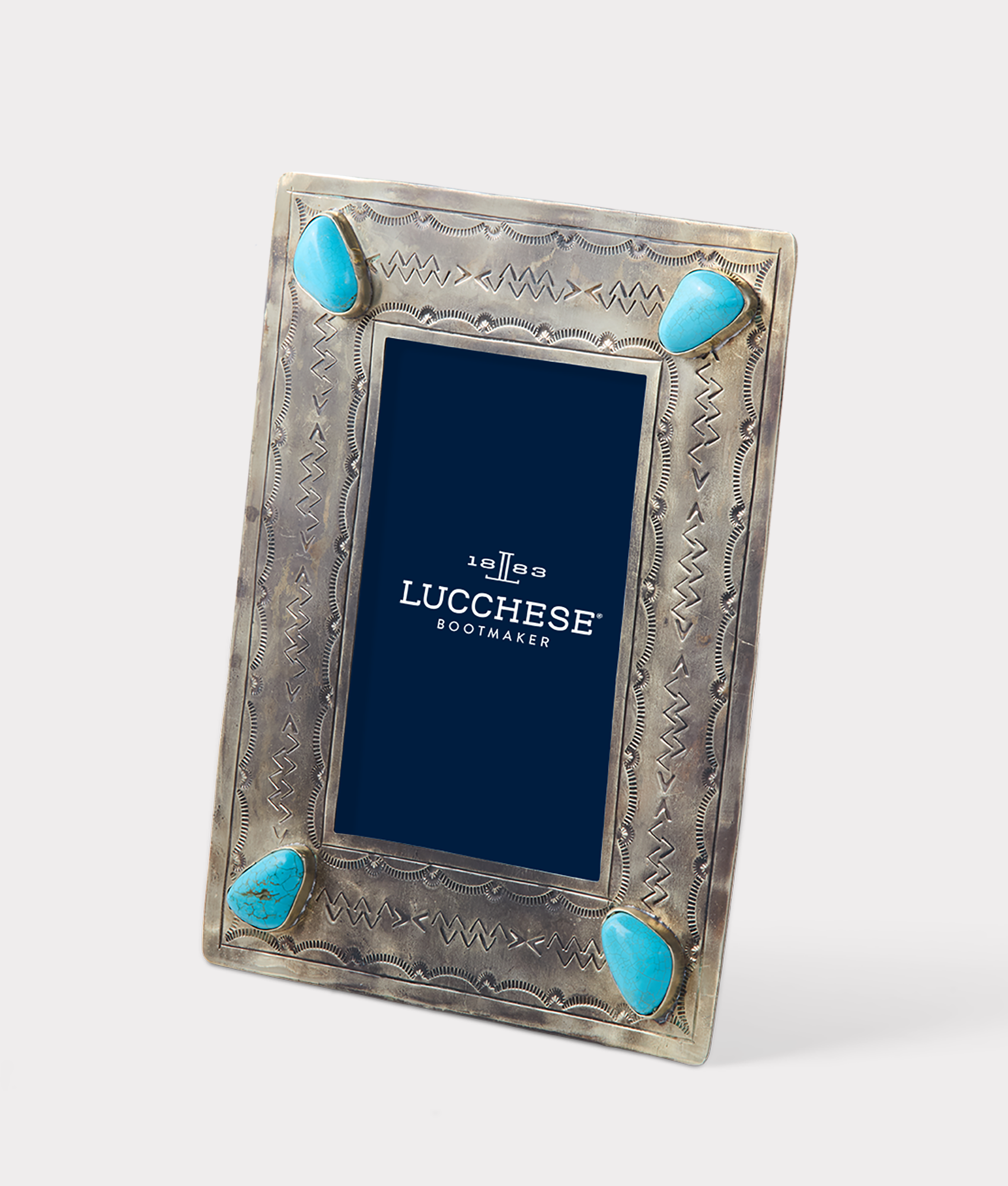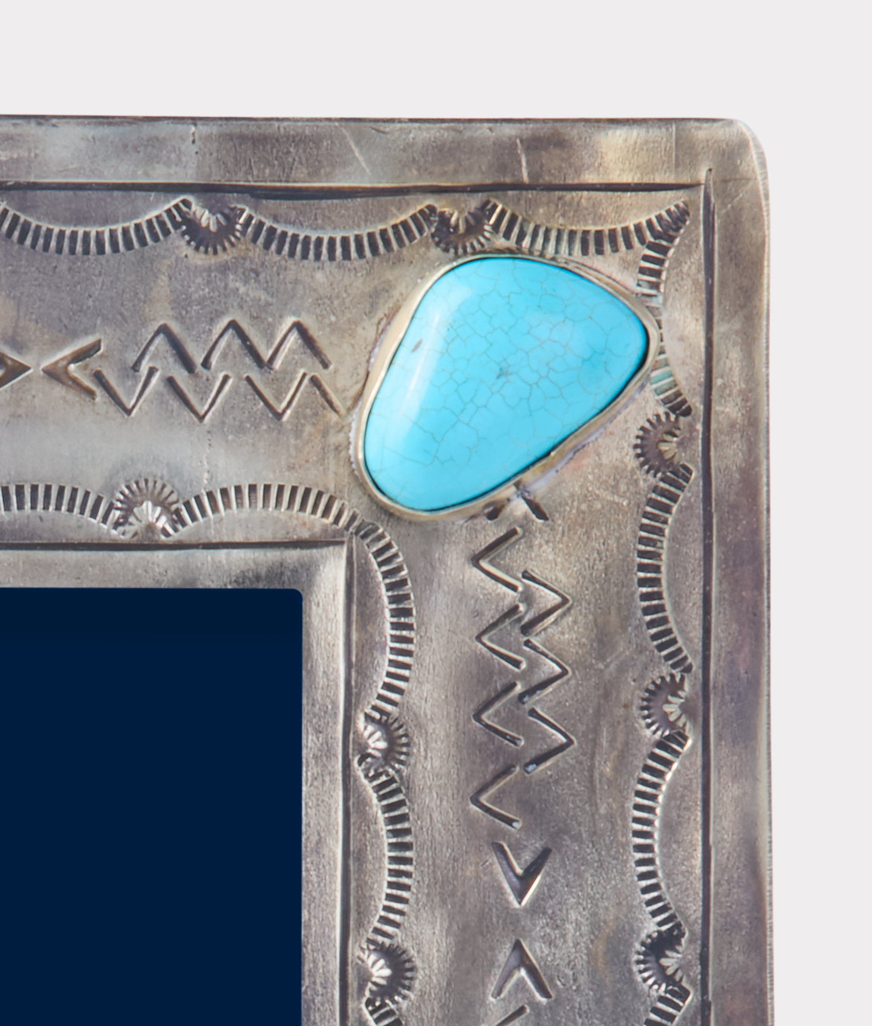The 4×6 Silver-Stamped Frame gives every photo a sparkle and touch of refinement. Handcrafted by skilled silversmiths. this piece adds Southwestern flair to any room – adorned with four turquoise stones.