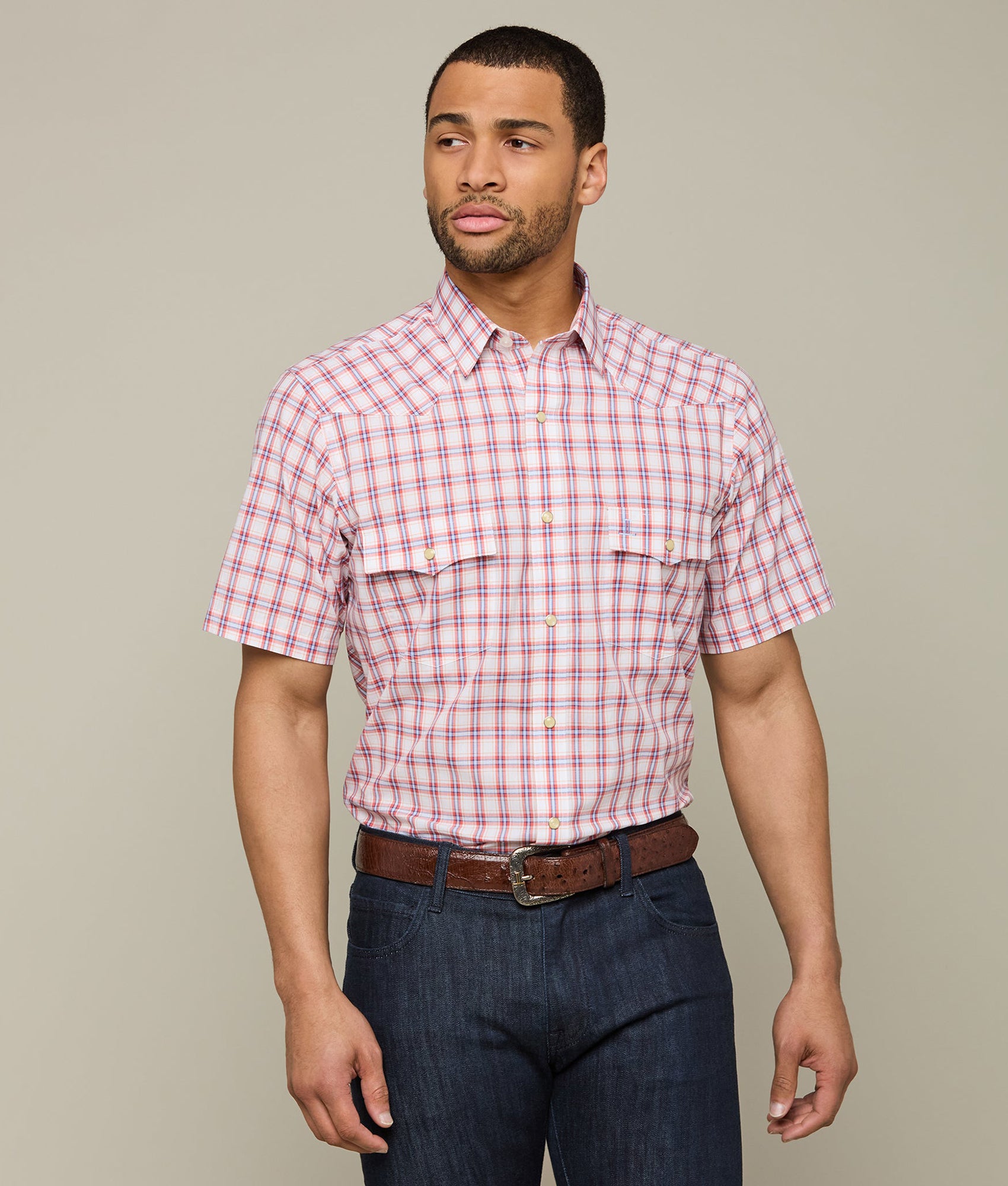 Named after the Texas city where our state capital stands. the Austin is a rugged. cotton Western shirt with snaps that features a cowboy yoke in front and back with a subtle. embroidered mirrored-L emblem on the left pocket and lower placket. Classic cowboy fit.