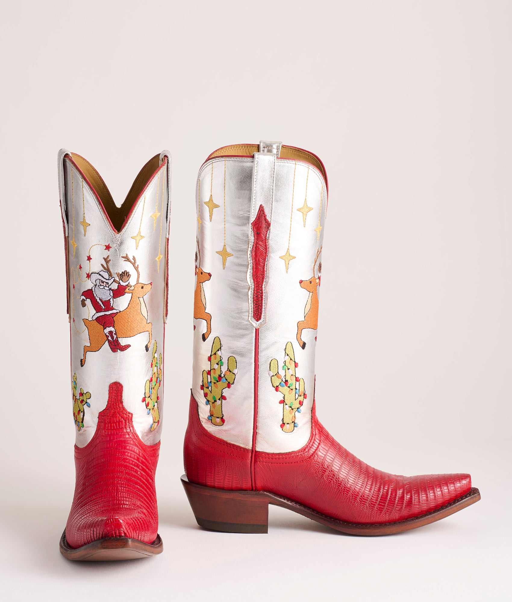 Bell is the first edition in Lucchese’s Christmas Annual. a limited series of festive holiday boots. She belongs in a cabinet of curiosities or maybe even atop your tree. Hand-stained red Lizard wraps the foot in a sculptural. berry-toned brilliance. its natural high-low hues coaxed to life by the careful hands of Lucchese’s master artisans. Rising above. a metallic-foiled Goat shaft. embroidered with a scene both whimsical and festive: Santa riding Rudolph beneath a constellation of stars. Christmas cactus lighting the way with a lasso of five-pointers to wrangle all the gifts for the long night’s trip. Laser-engraved: Lucchese Christmas First Edition 2025. Handmade in Texas.