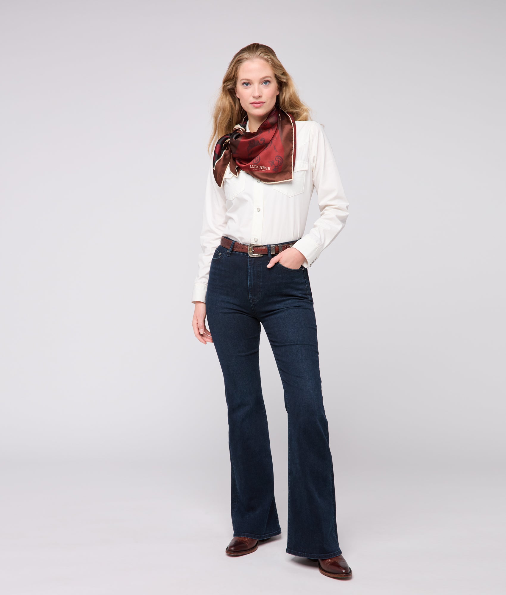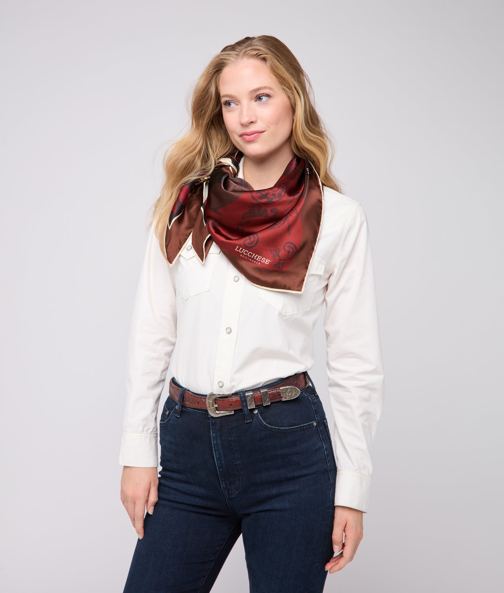 Harness your beauty. Rooted in our equestrian and cavalry heritage. the Cavalry Scarf offers not only the highest quality silk. but endless fashion-forward getups for the regal bearing men and women. The scarf explores symbols. culture. myth. refined colors and layers in the design. The mingling of Western flora and fauna manifests romance and high-fashion of the West. Get creative – around your neck. ribboned on a bag. or hanging on a wall. the Lucchese Silk Square Scarf is meant to be seen.