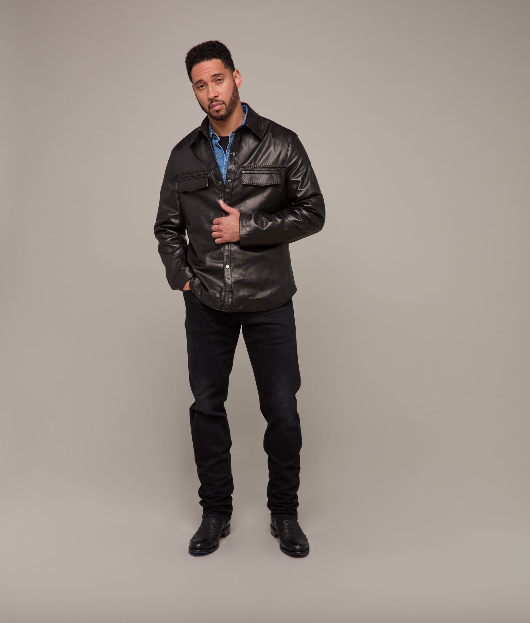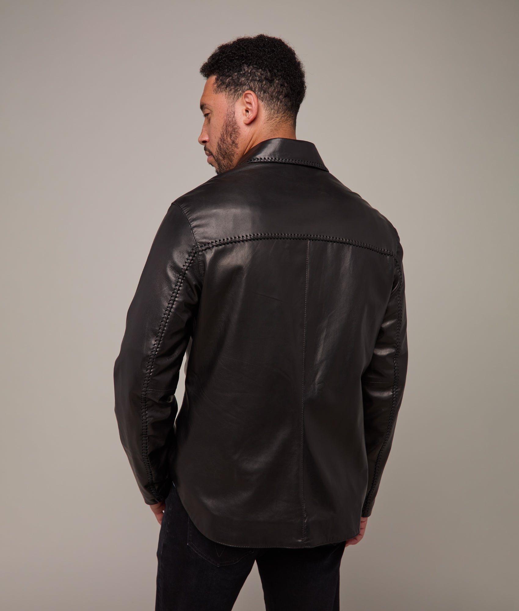 An exemplar of American leathercraft. the Clint is meticulously constructed in the USA from premium lamb leather. chosen for its unmatched softness and natural luster. The jacket’s silhouette is defined by precision whipstitch detailing along the chest pockets and collar. Fully lined in 100% acetate for a fluid drape. it closes with a series of polished snap fasteners. balancing function with understated form.