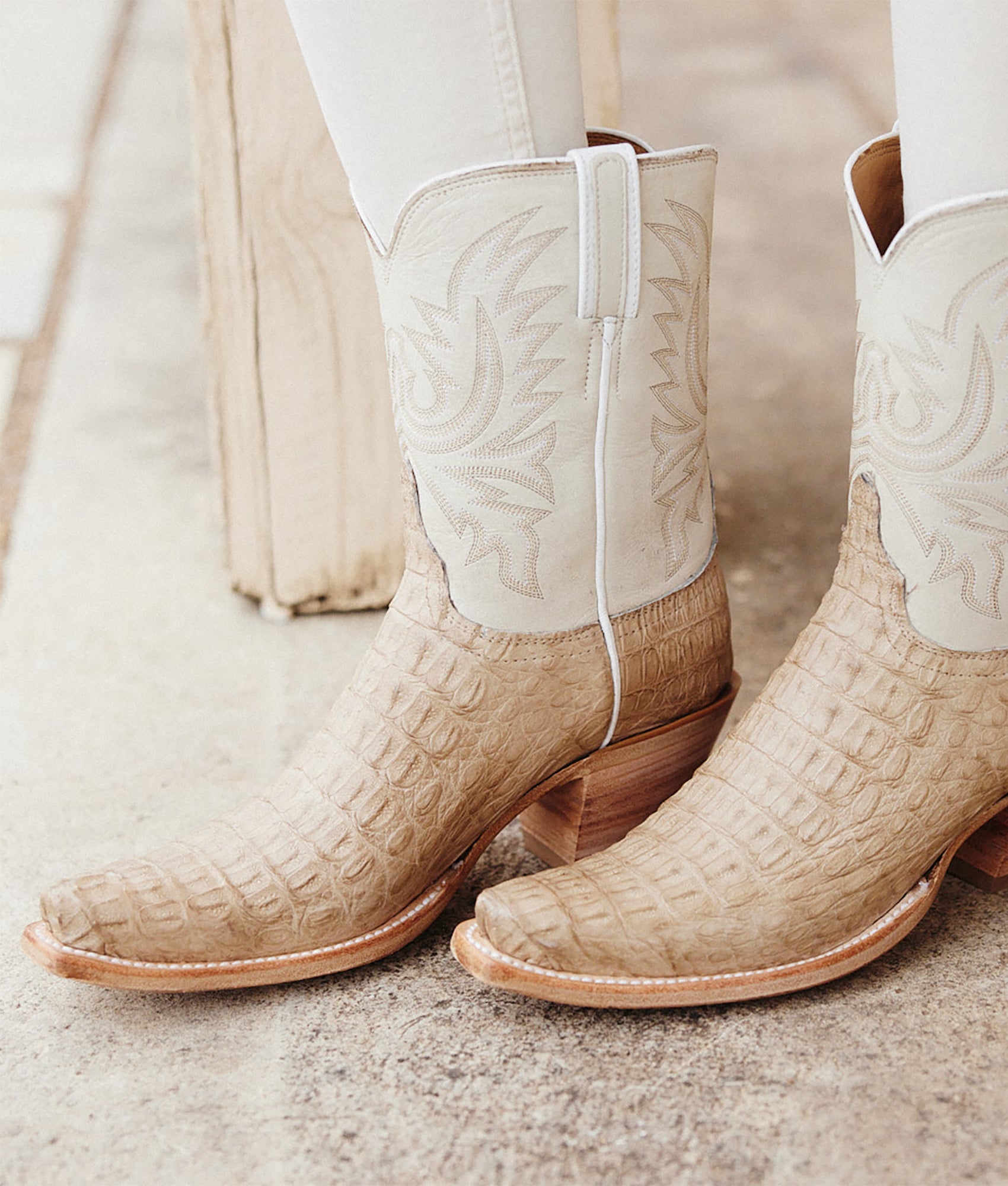 The Dale Exotic is an exciting fashion statement. It brings together coveted Hornback Caiman and smooth Goat leather for a look that’s retro inspired but refreshingly current. The 9-inch quarters are a little shorter than many cowgirl styles; a 2-inch heel that lends a little overall height. The New Leaf stitch pattern nods to Western motifs. Under dresses or over jeans. Dale Exotic turns heads. Handmade in Texas.