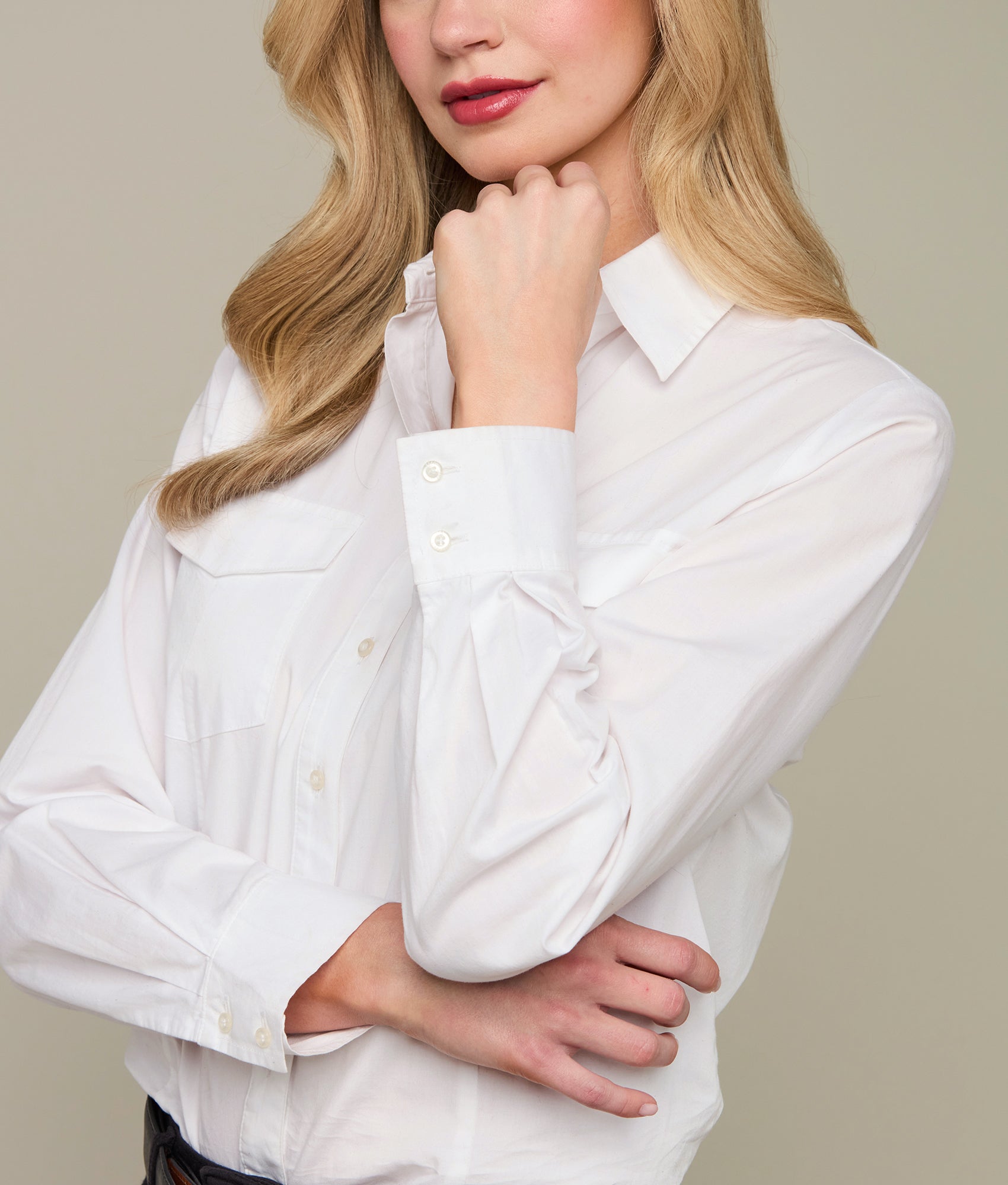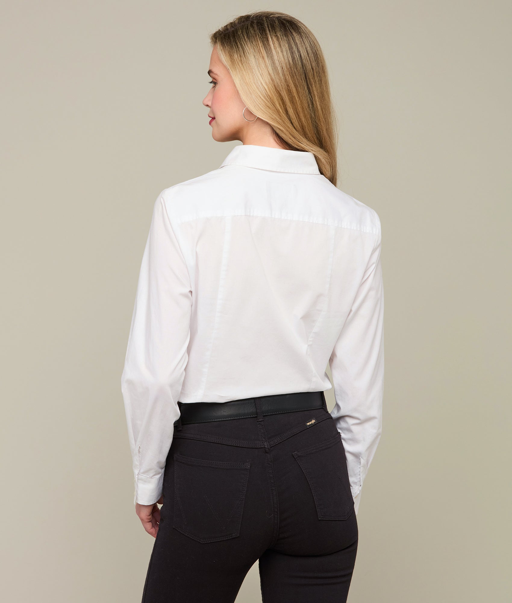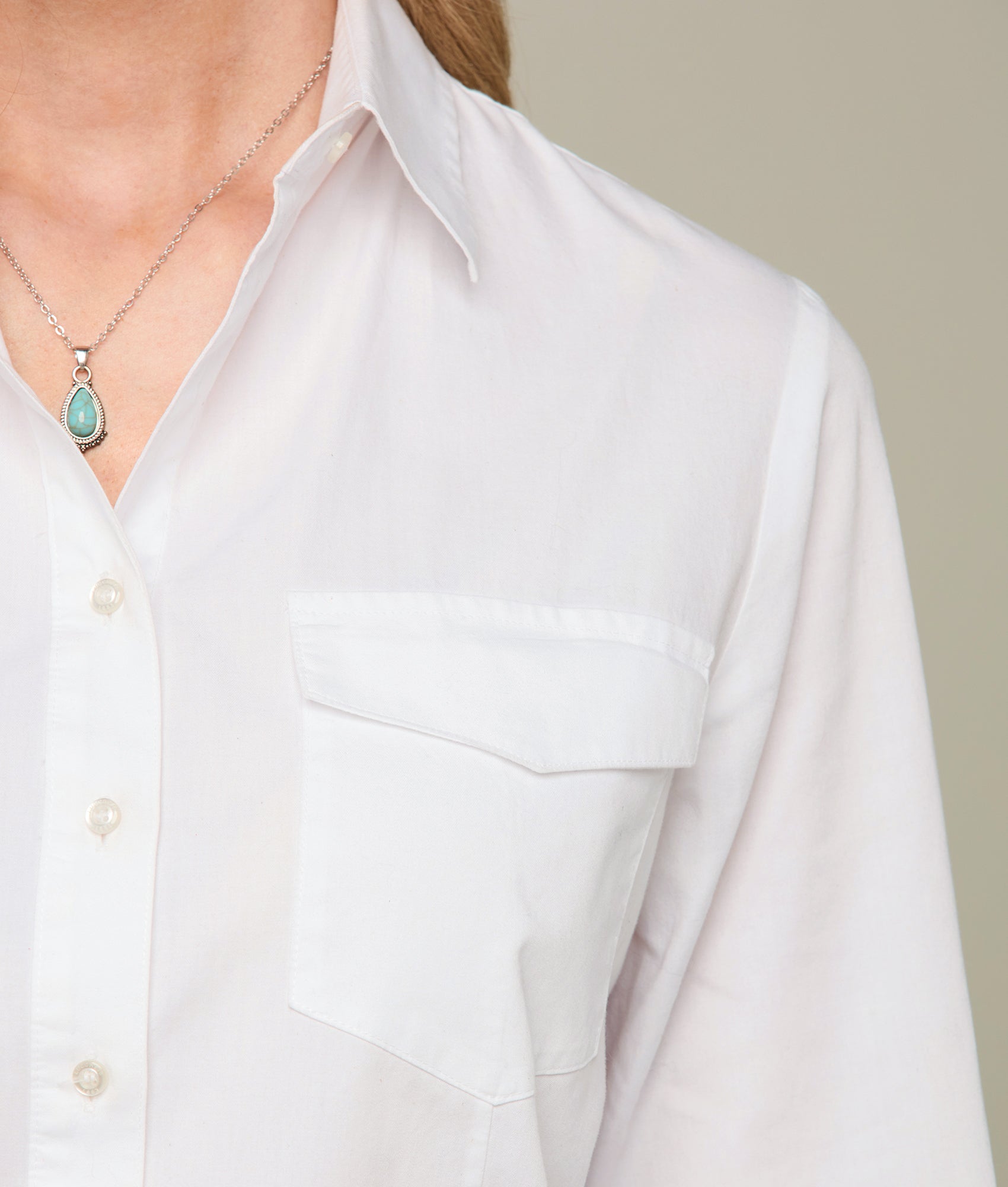 The Dallas is a chic. cotton women’s shirt featuring a shirttail hem yoke with a subtle. embroidered mirrored-L emblem on the pocket.