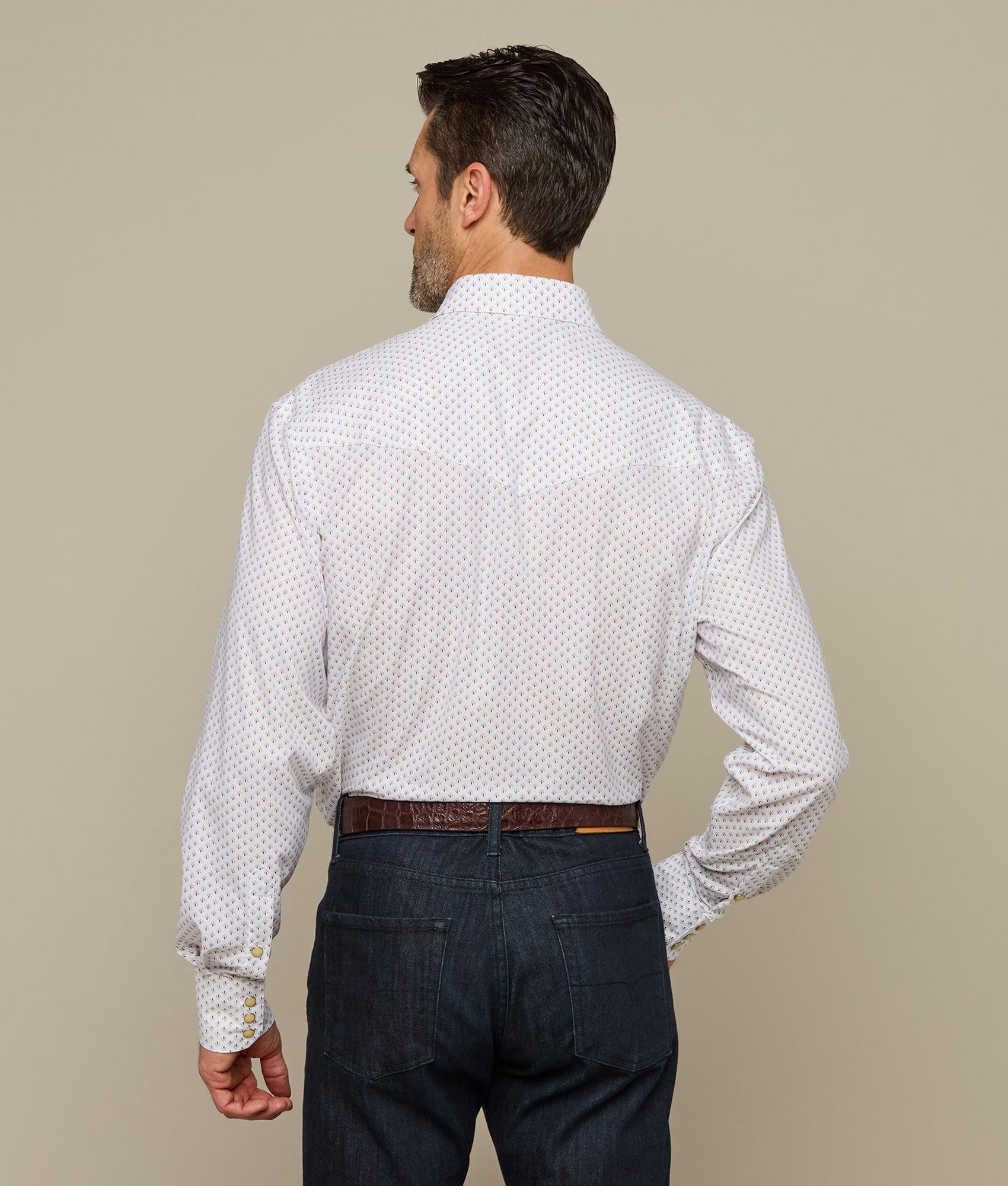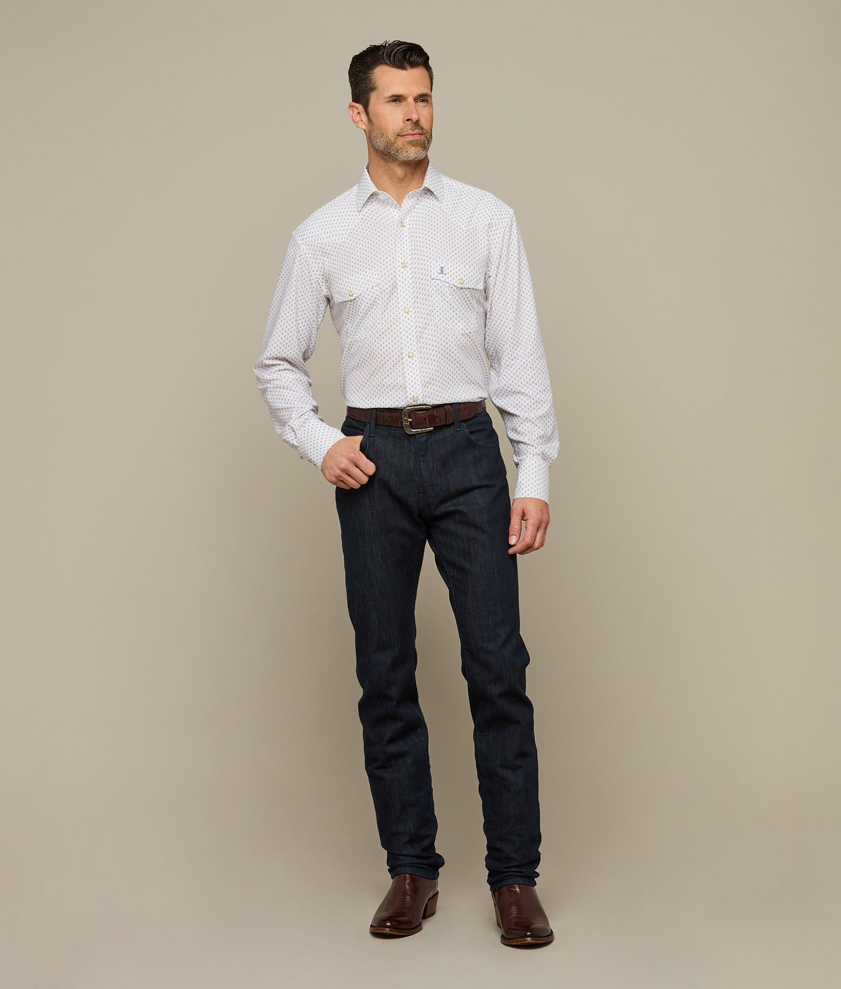Named for our El Paso factory. this rugged western shirt features a cowboy yoke in front and back with a subtle. embroidered mirrored-L emblem on the left pocket and lower placket. Classic cowboy fit.