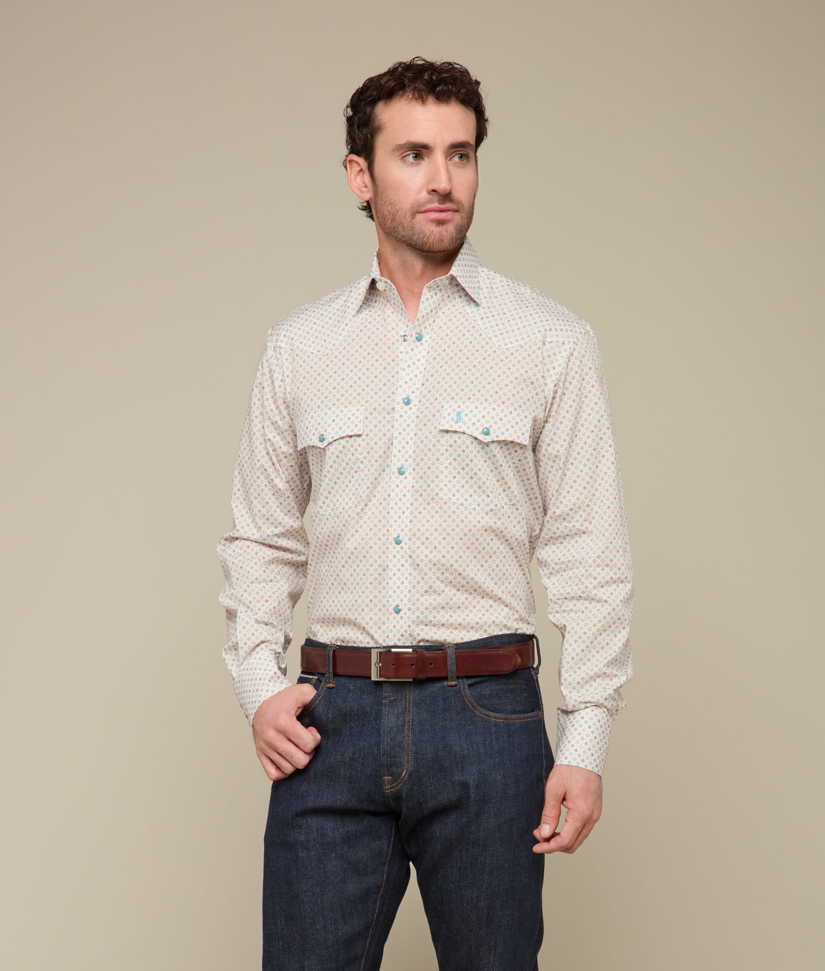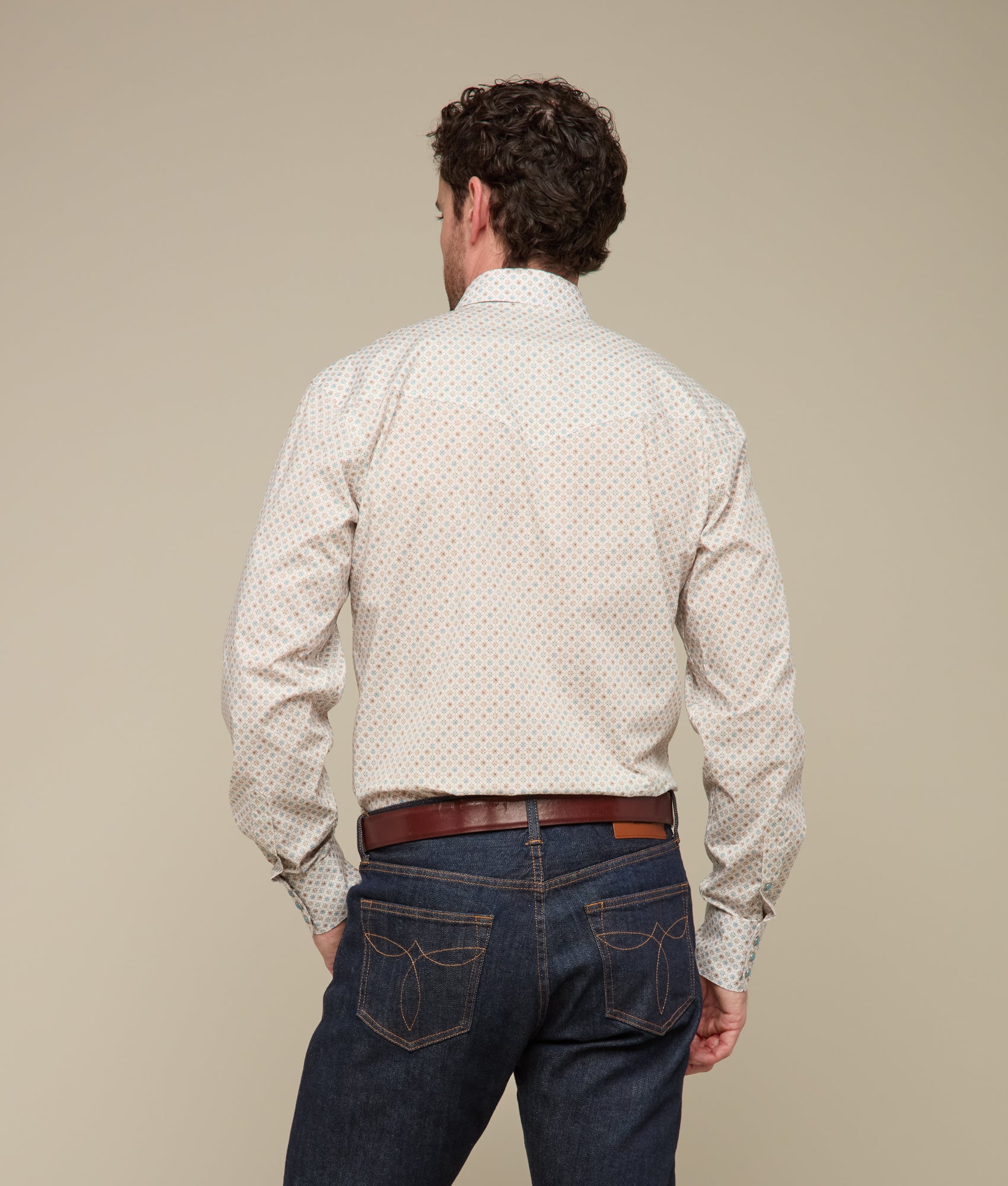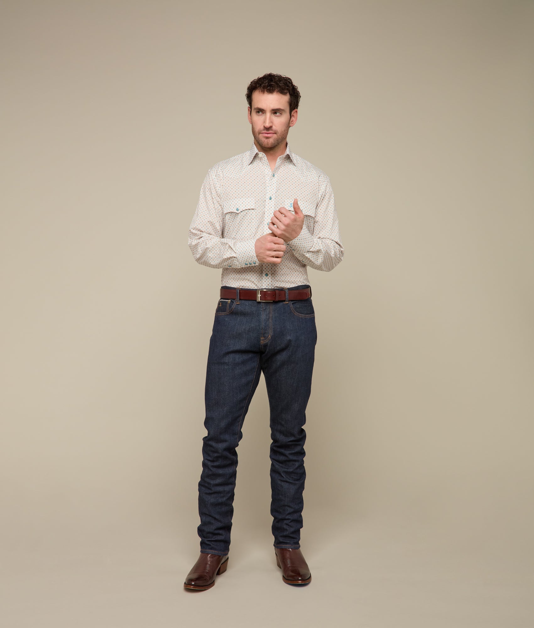 Named for our El Paso factory. this rugged. cotton western shirt features a cowboy yoke in front and back with a subtle. embroidered mirrored-L emblem on the left pocket and lower placket. Classic cowboy fit.