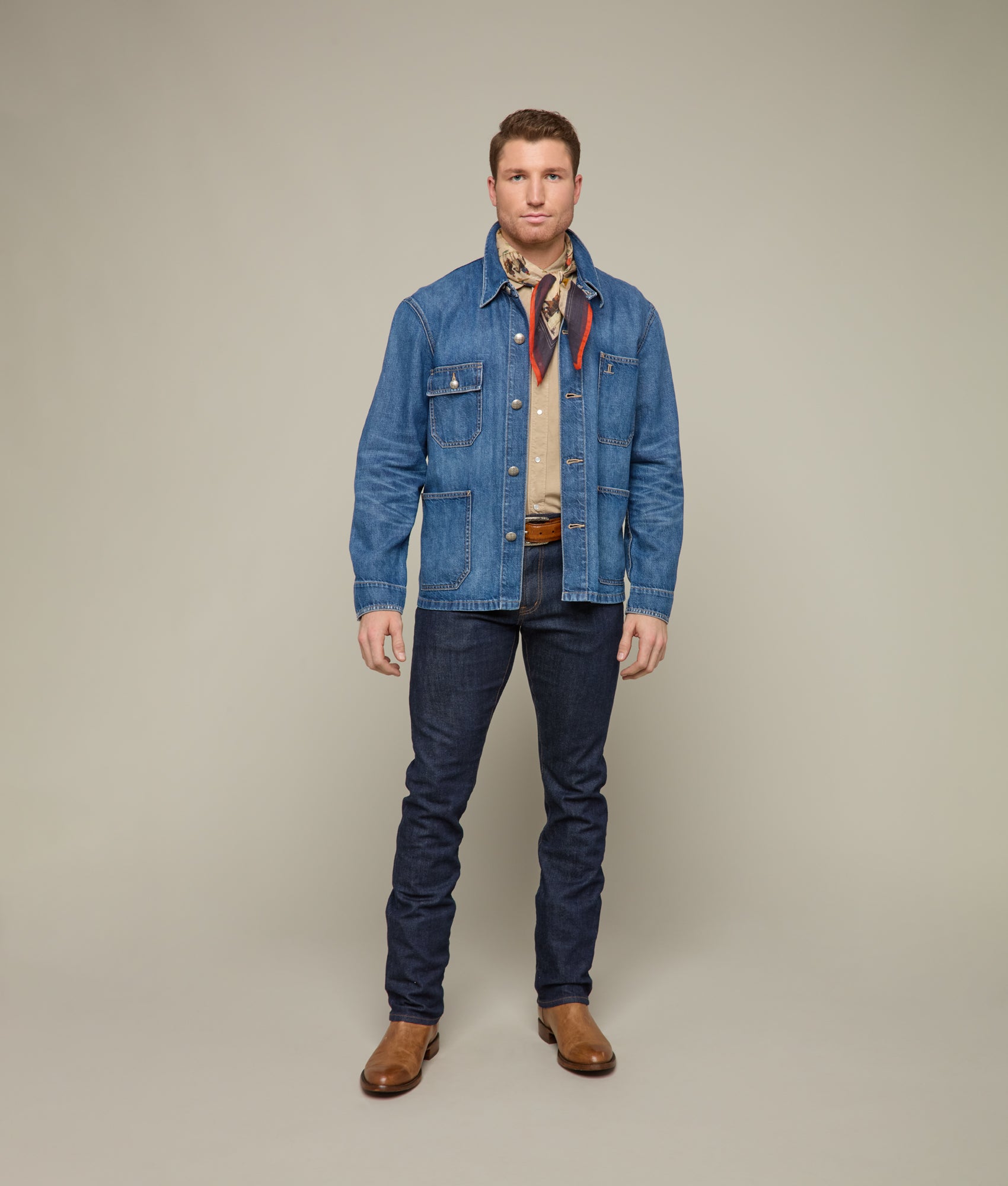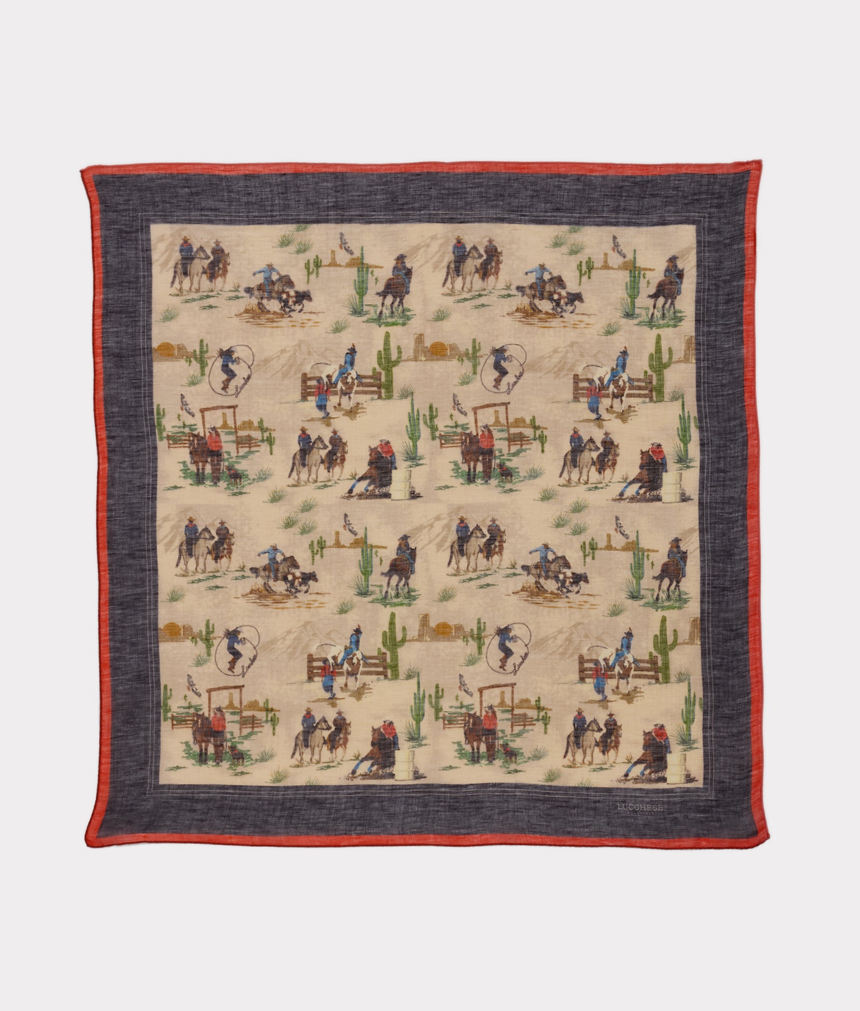 Endless elegance corralled in a single silk scarf. Wrangled from the Lucchese archives this pattern is a sheer depiction of the West. in days of old. This scarf offers not only the highest quality silk. but endless fashion-forward getups for the cowboys and cowgirls. The vintage scenes and natural tones of the Western frontier holler high-fashion. Get creative – around your neck. ribboned on a bag. or hanging on a wall. the Lucchese Frontier Scarf is meant to be seen.