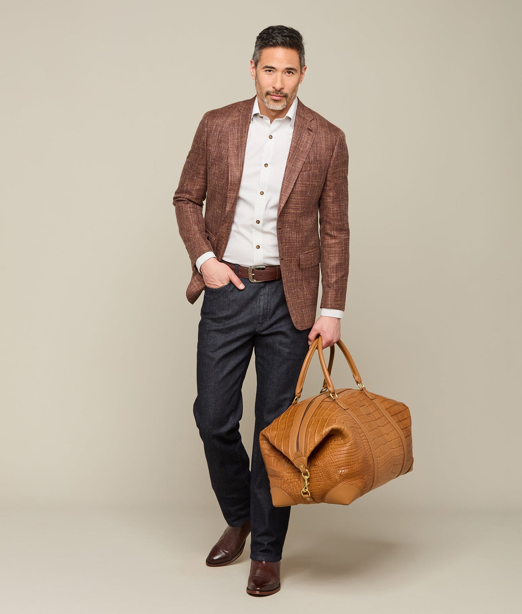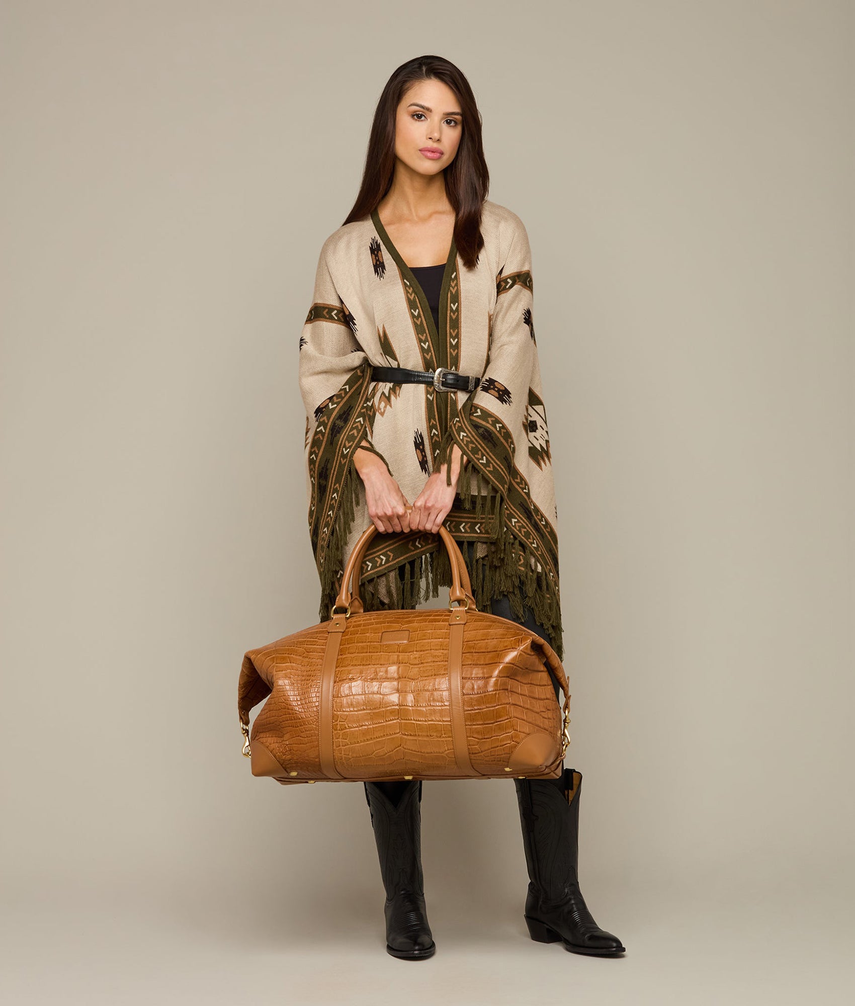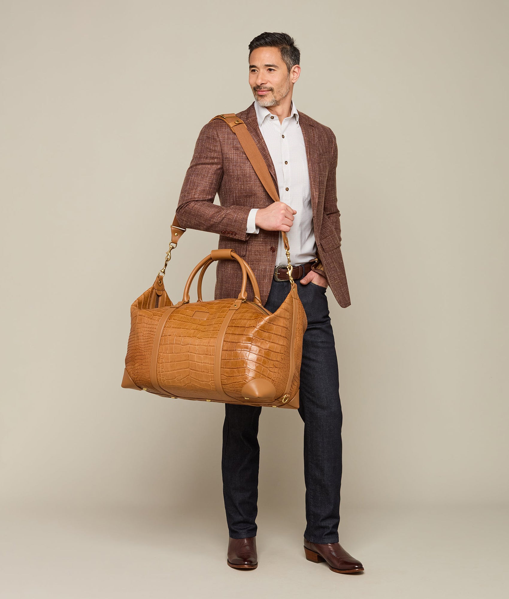 Built with Lucchese’s own giant American alligator. this signature duffle?totes your essentials in first class style. The fold-end construction allows for maximum packing space. which includes natural. water-resistant canvas lining. an interior zipper pocket and two open storage slots.