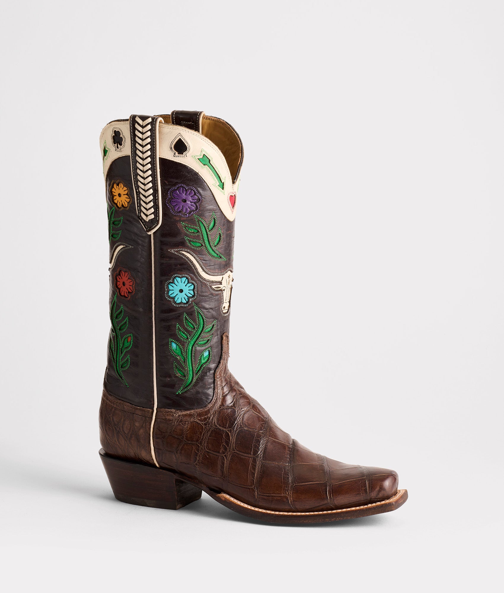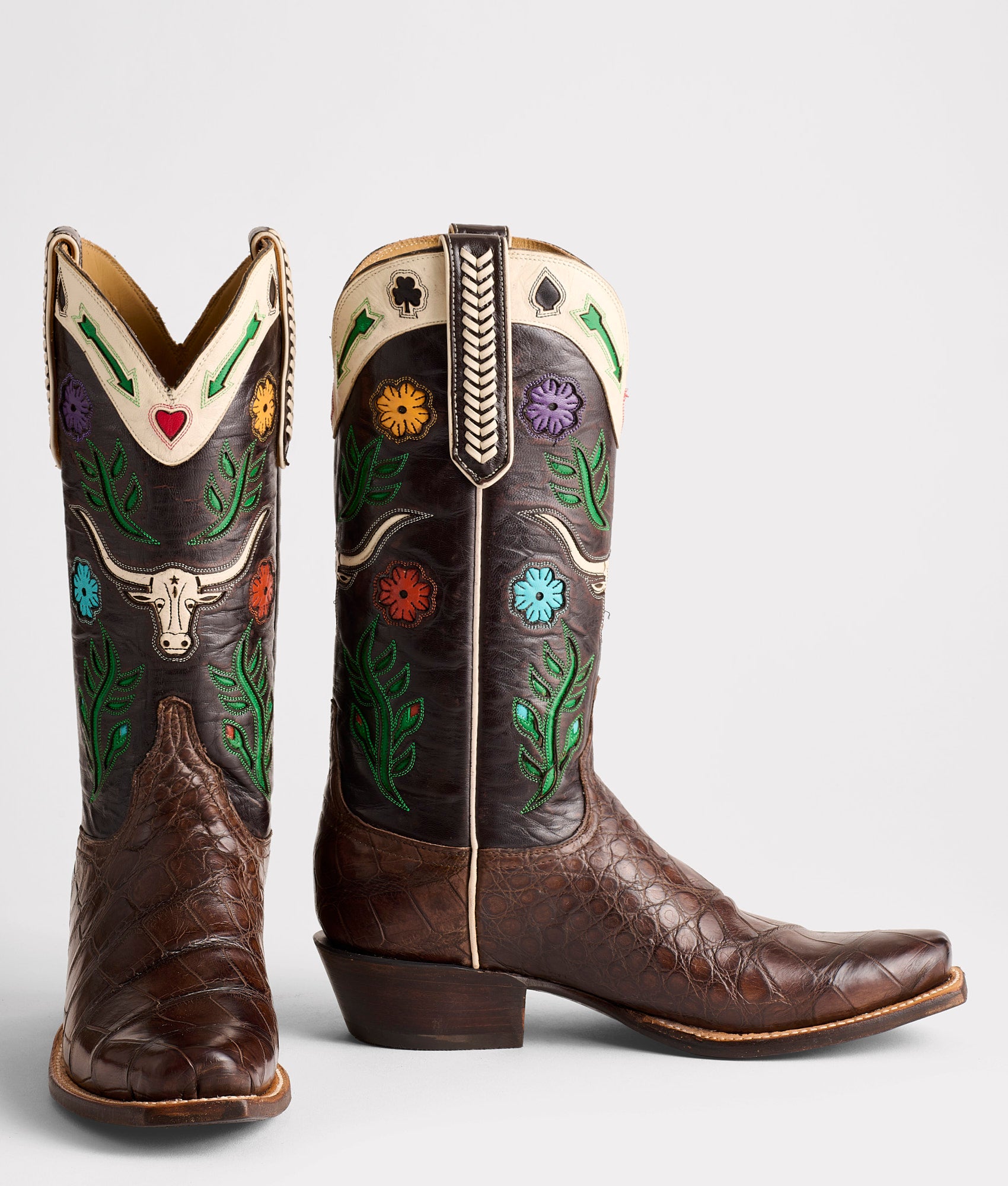 An heirloom. An ode. A statement told through craftsmanship. The Hat Tipper honors tradition with every cut and stitch. Its silhouette is a canvas for the time-tested artistry of our El Paso bootmakers. From collar to quarter. the Gallardo motifs tell the story of the West. saturated in rich color and layered with depth and texture. The 16-row. hand-laced Goat pull straps draw the eye down the crème side seam to the vamp. where every cut of Wild-Caught American Alligator reflects the respect our artisans show the process—hand-selected. hand-matched. and crafted with care. Respect begins with the work. not the words—Hat Tipper says more than the man will ever have to. Handmade in Texas.