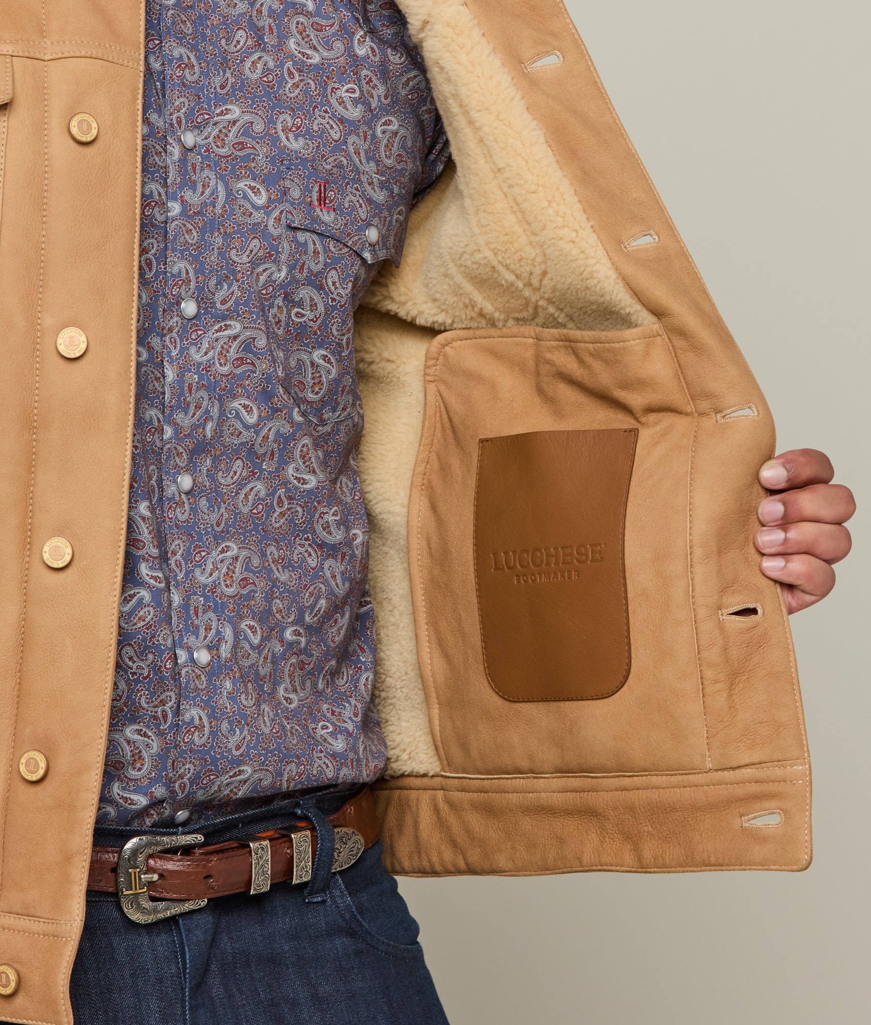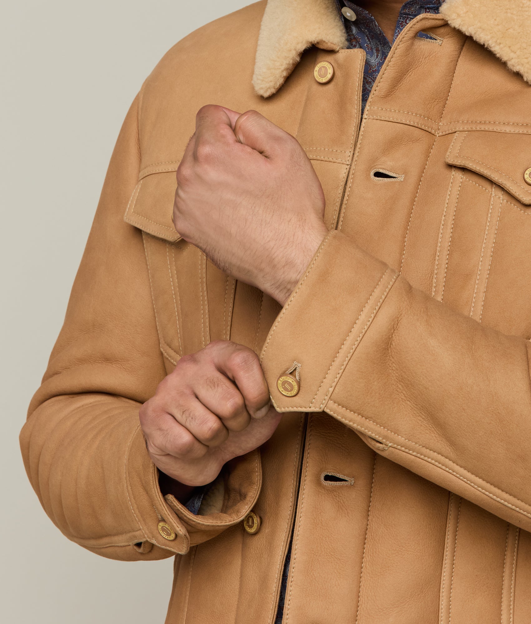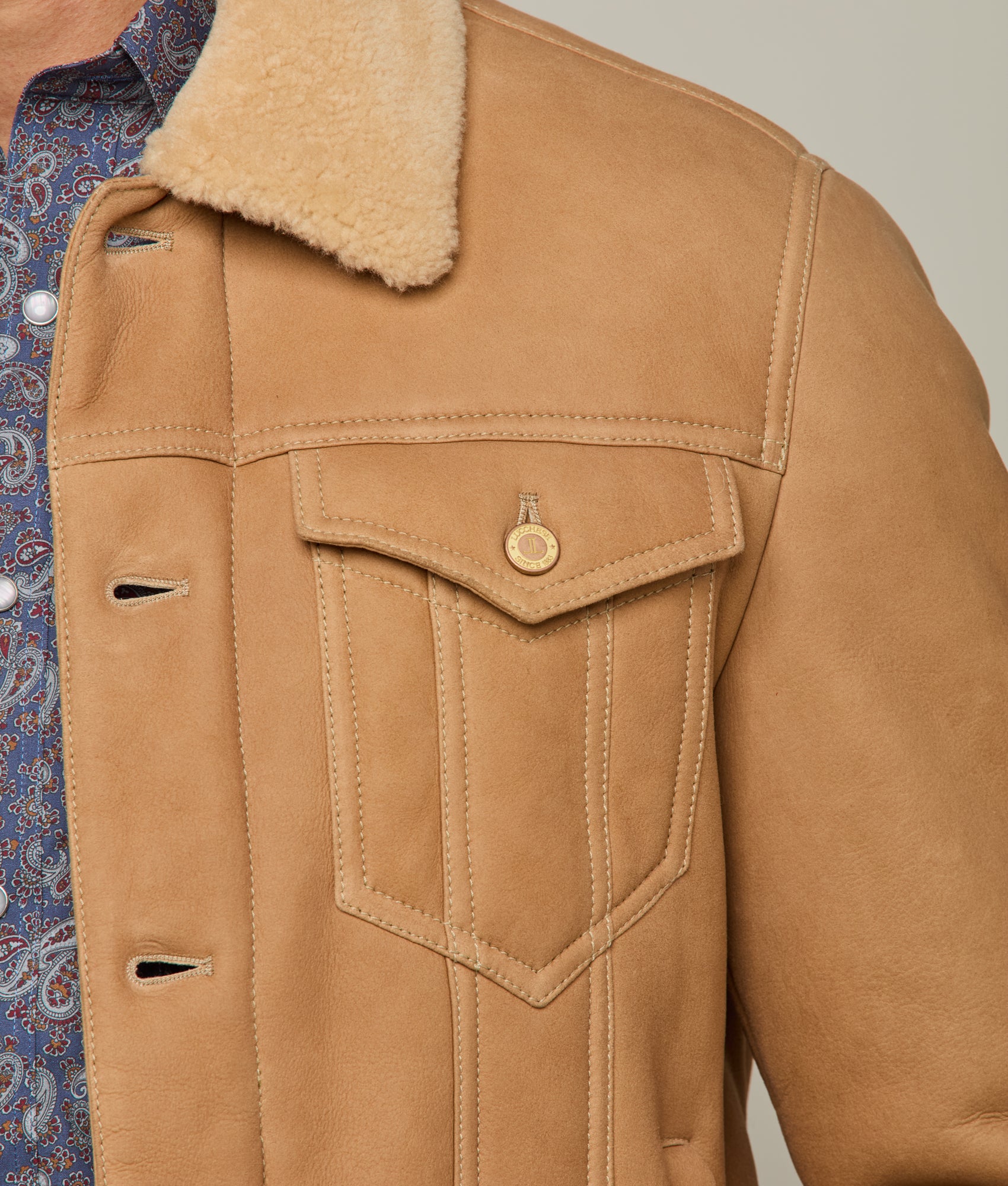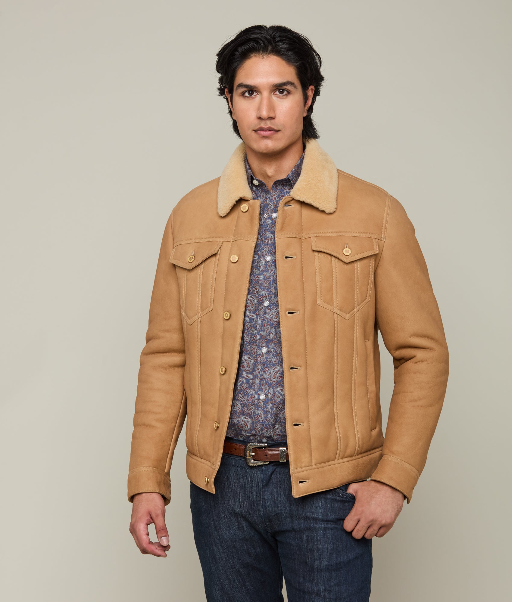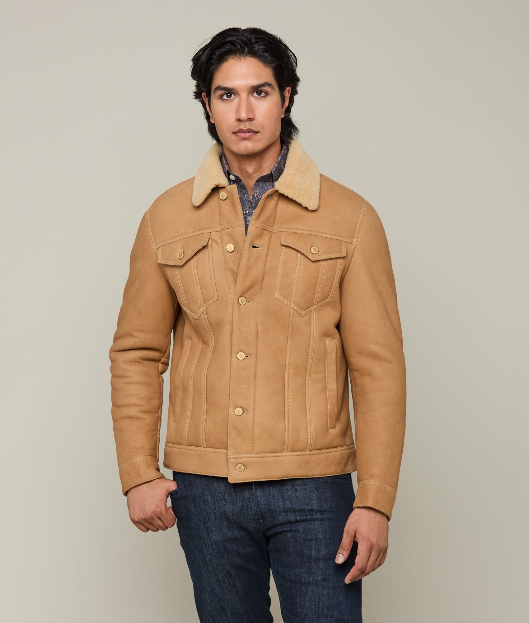 Crafted with meticulous attention to detail. the Shearling Trucker Jacket epitomizes sophisticated elegance. Its robust silhouette boasts a dual chest pocket arrangement. offering both functionality and style. Frontal buttons seamlessly integrate into the jacket’s design. complementing the structured shearling collar that defines the neckline. This rustic piece is a necessity during the colder months.