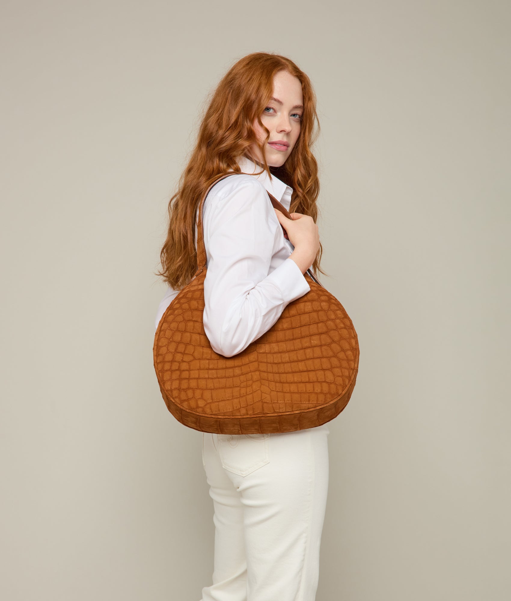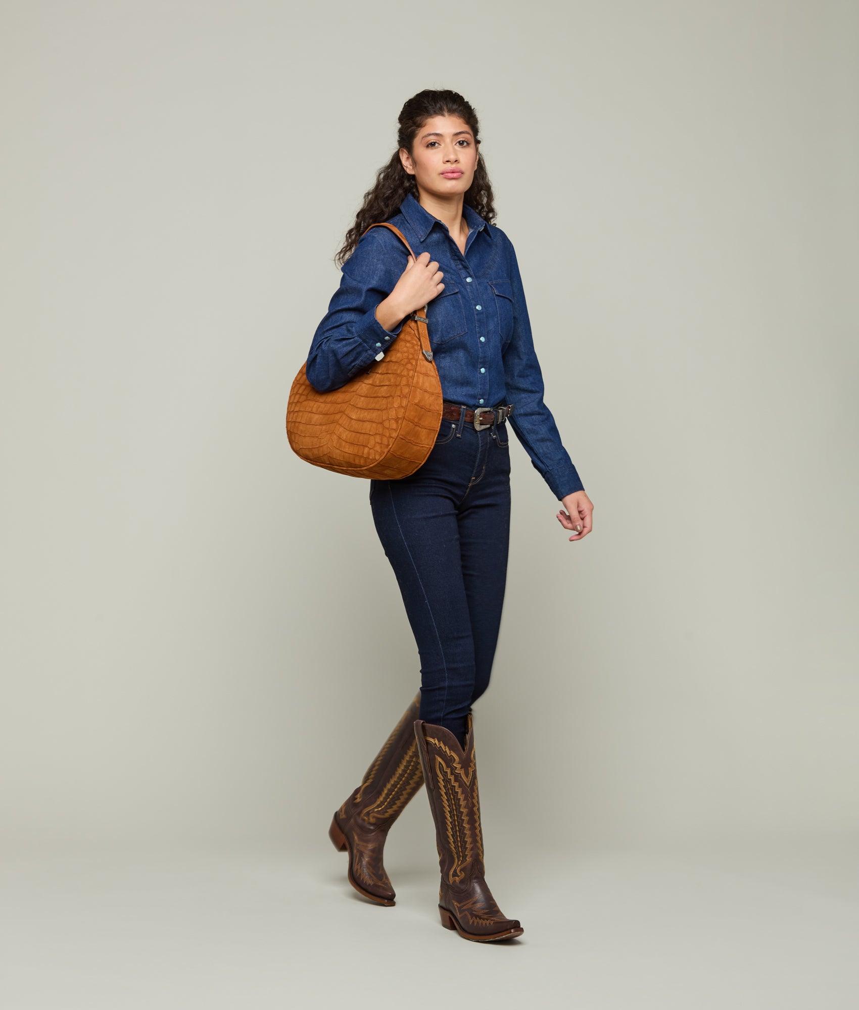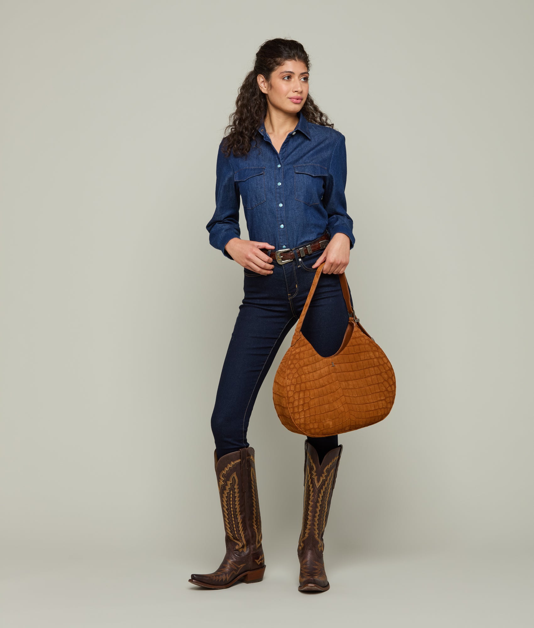 The premium Large Heidi Exotic Hobo Bag is handmade from traditional leather techniques. This uniquely shaped bag is crafted from Sueded Crocodile leather for a super-luxe look. This breathtaking piece will hold all your personal items for a day in Ibiza or a night in the big apple. A western buckle is a sprinkle of western flair to an iconic silhouette.