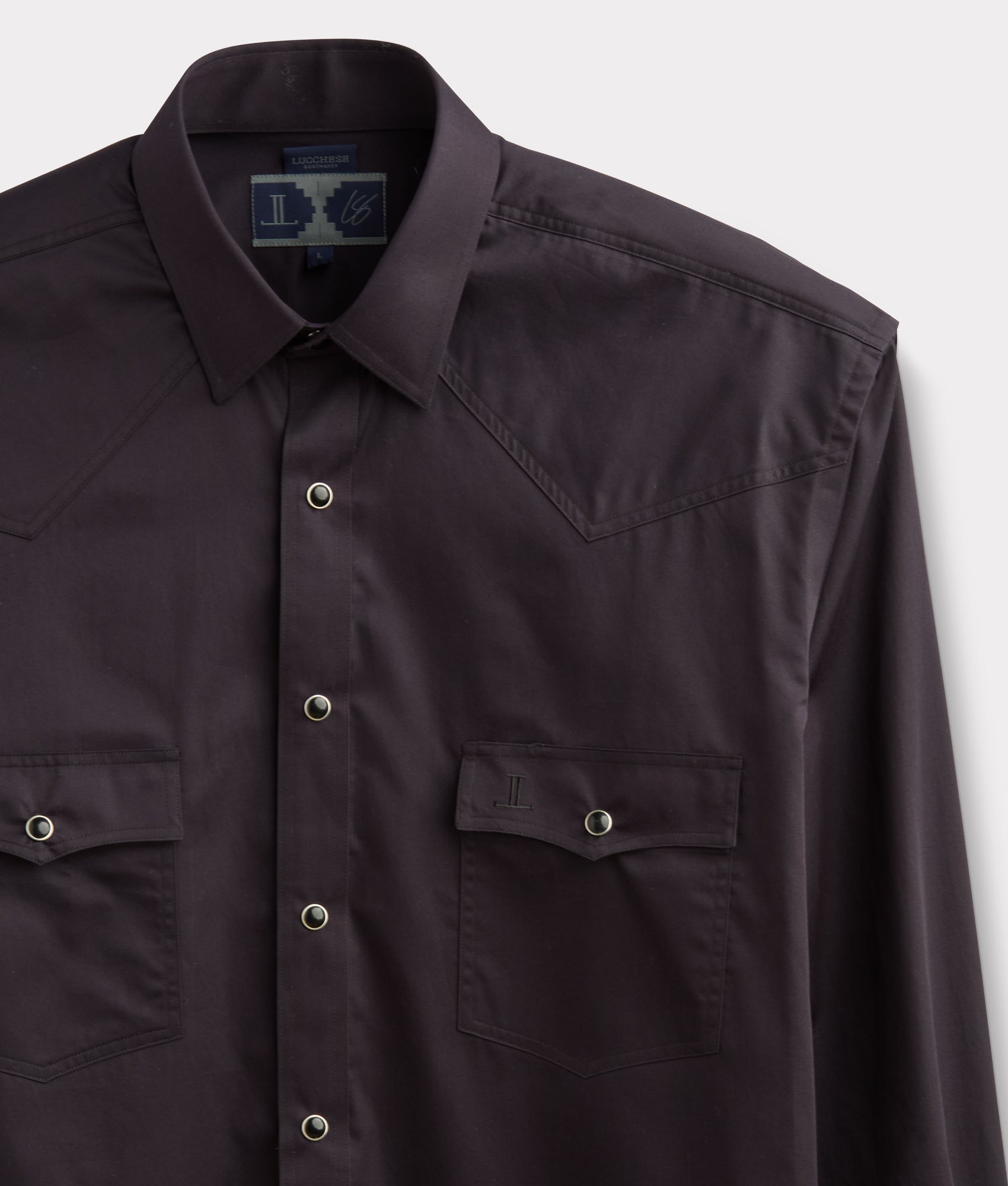 Part of the Chris Stapleton collection and named after our El Paso factory. this rugged. cotton Western shirt features a cowboy yoke in front and back with a mirrored-L on the front left pocket and a signature co-branded Lucchese x Chris Stapleton tag. Classic cowboy fit.