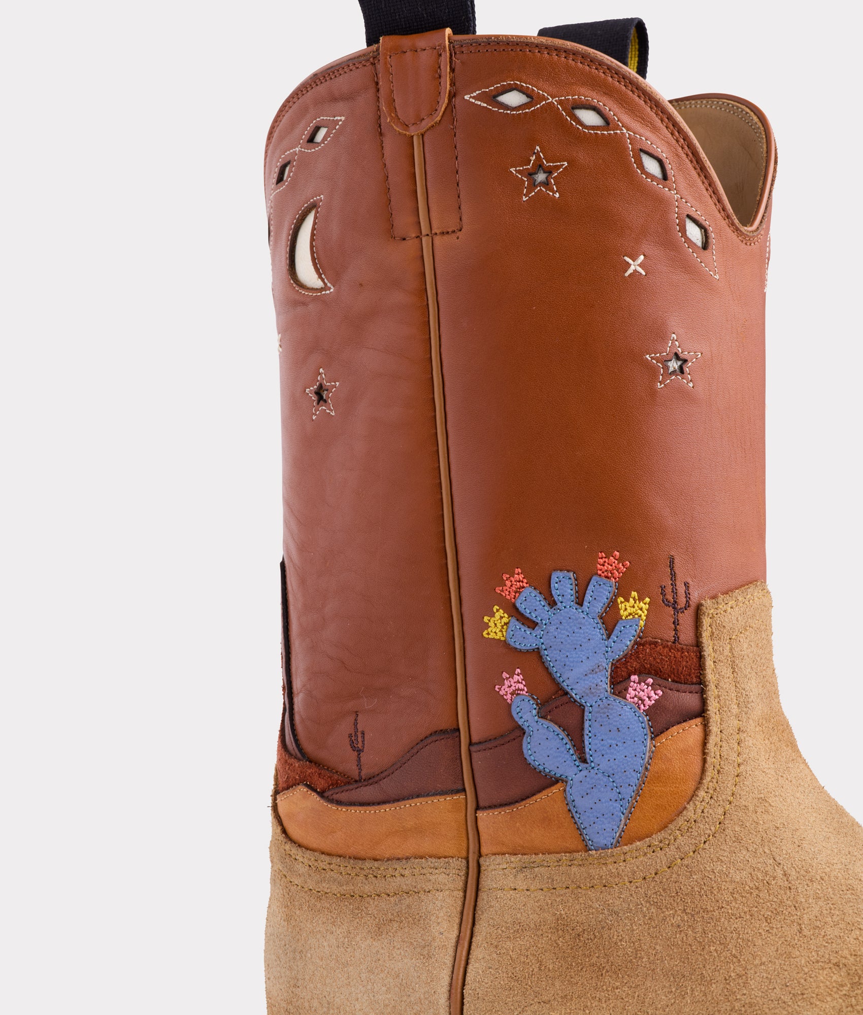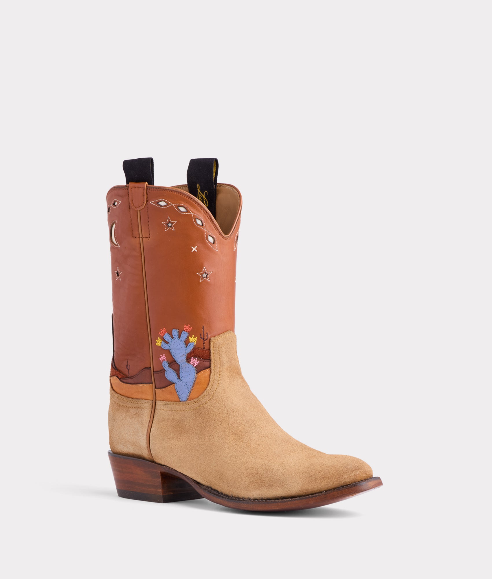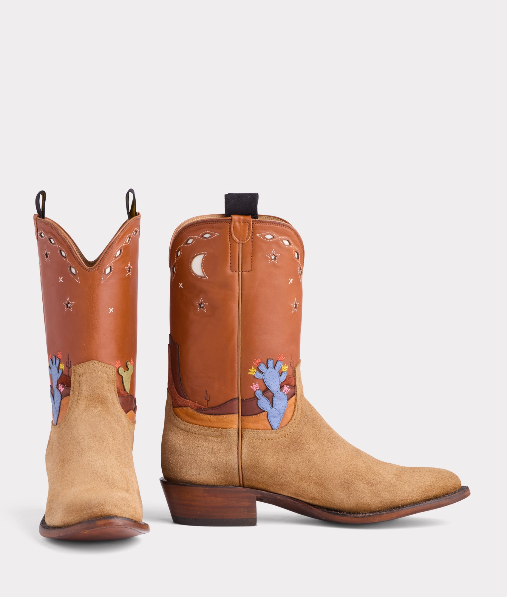 The Men’s Desert Sands is a reinterpretation on a classic style ?C a nod to the unforgiving landscape and cowboy life. Crafted from a mirage of leathers by the world’s best artisans. a desert night has never looked more inviting than it does now. Waxed Rough Out Suede on the vamp alludes to the rugged terrain that a cowpoke would encounter during the days of the Westward Expansion – an ever-shifting frontier translated through consistent craftsmanship. Hand-selected and hands down a collector’s piece. Signature Lucchese x NF pull straps aid in pulling on your Desert Sands. Designed in partnership with Nick Fouquet. Handmade in Texas.