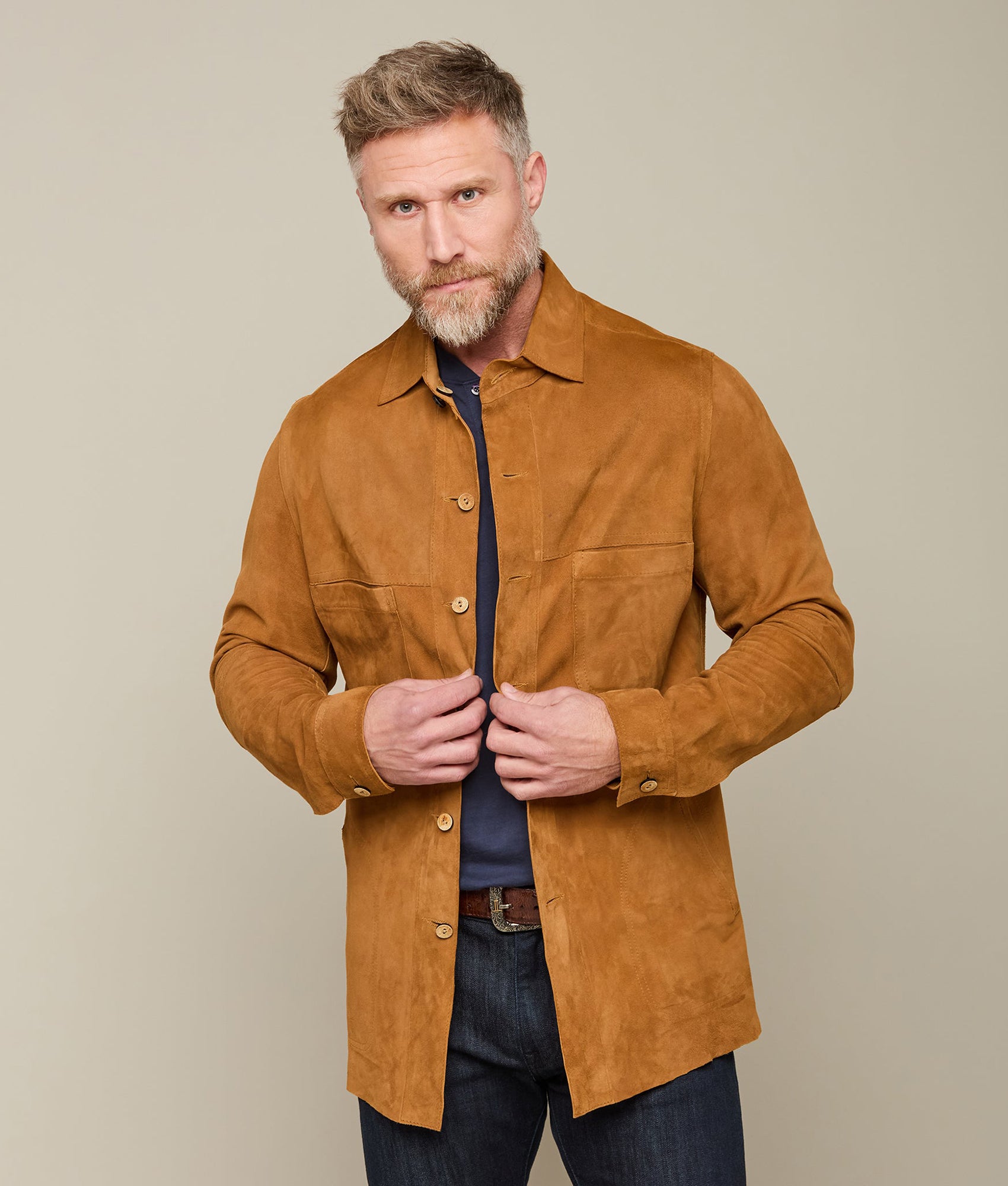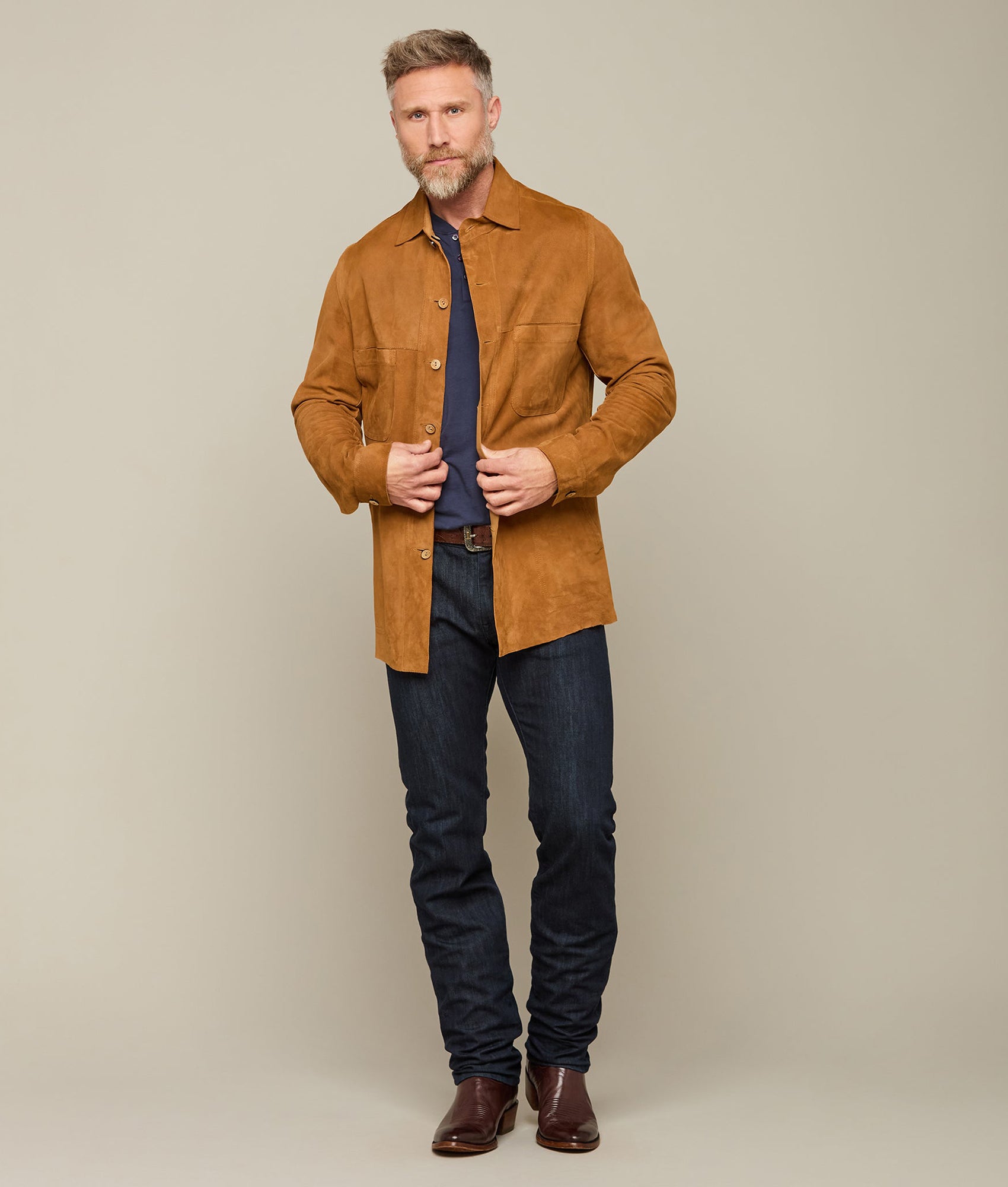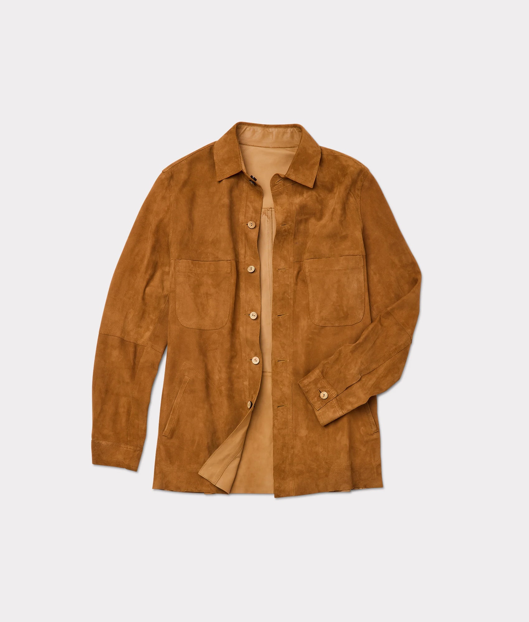 The Reversible Shacket in cinnamon is fashioned from luxurious suede and calf leather allowing it to be dressed up or down with ease. Fitting longer in the tail. this shacket will go over a t-shirt. dress shirt. or flannel. Dressing up for a night on the town has never been so easy. Clean professionally.?