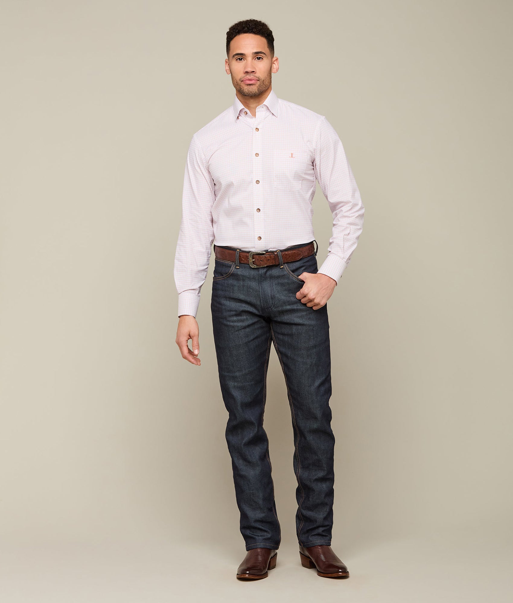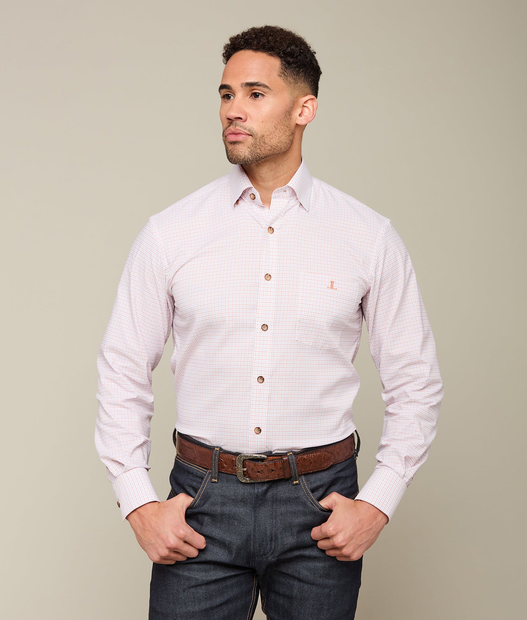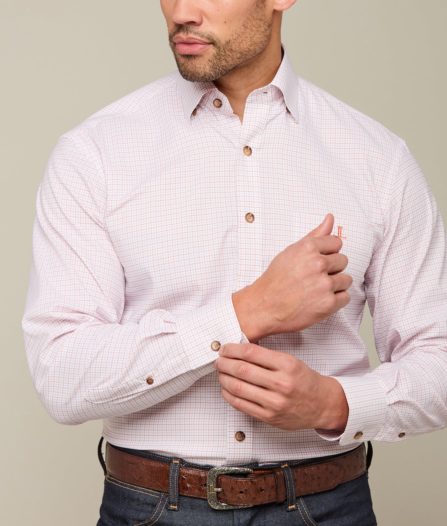 Named for the Texas city where Lucchese originated. this refined nylon and spandex shirt features a hidden button-down collar. open single-patch pocket with pen slot and a cowboy yoke in back for understated Western flair. A subtle. embroidered mirrored-L emblem on the left pocket and lower placket adds interest. Classic cowboy fit.