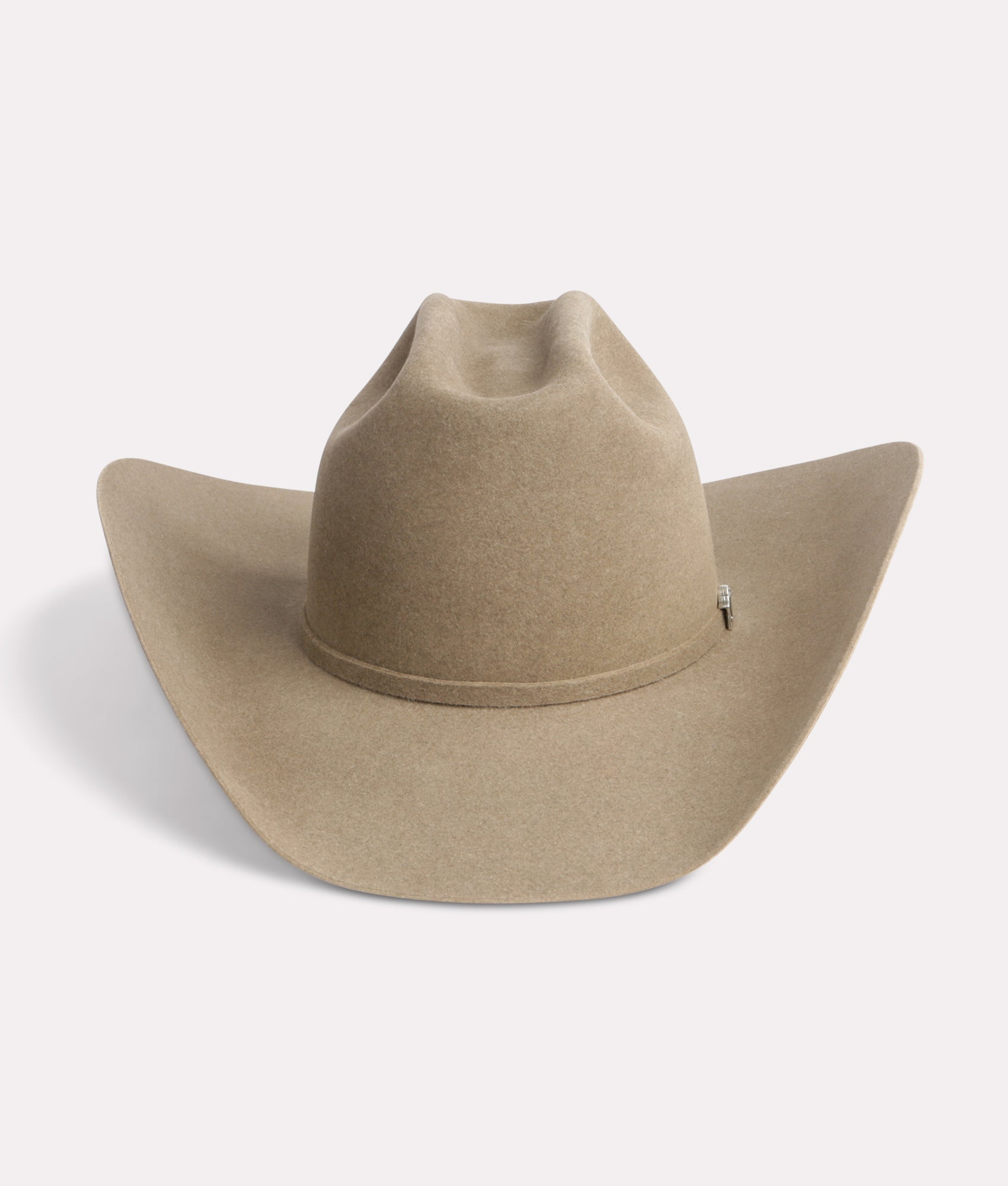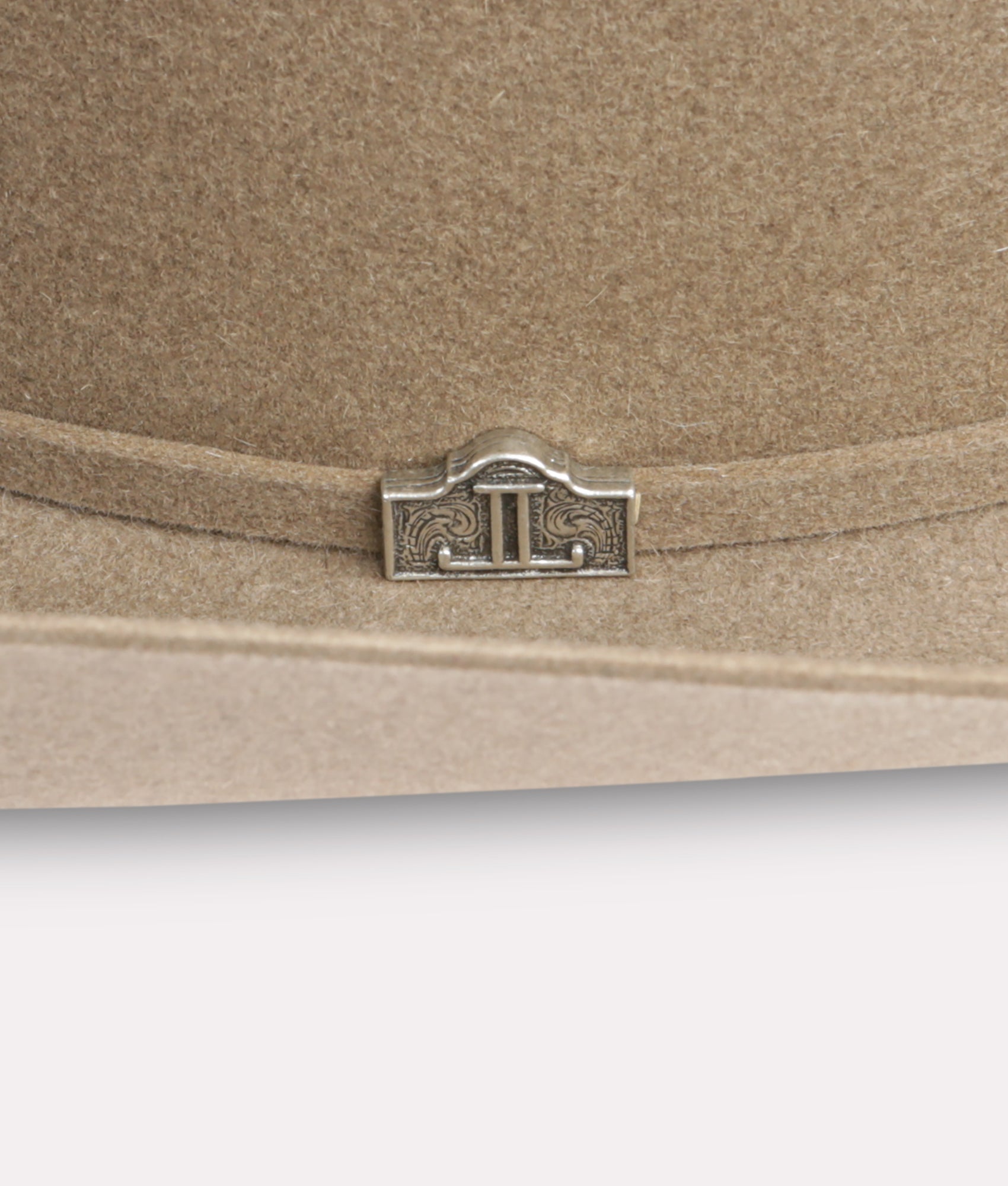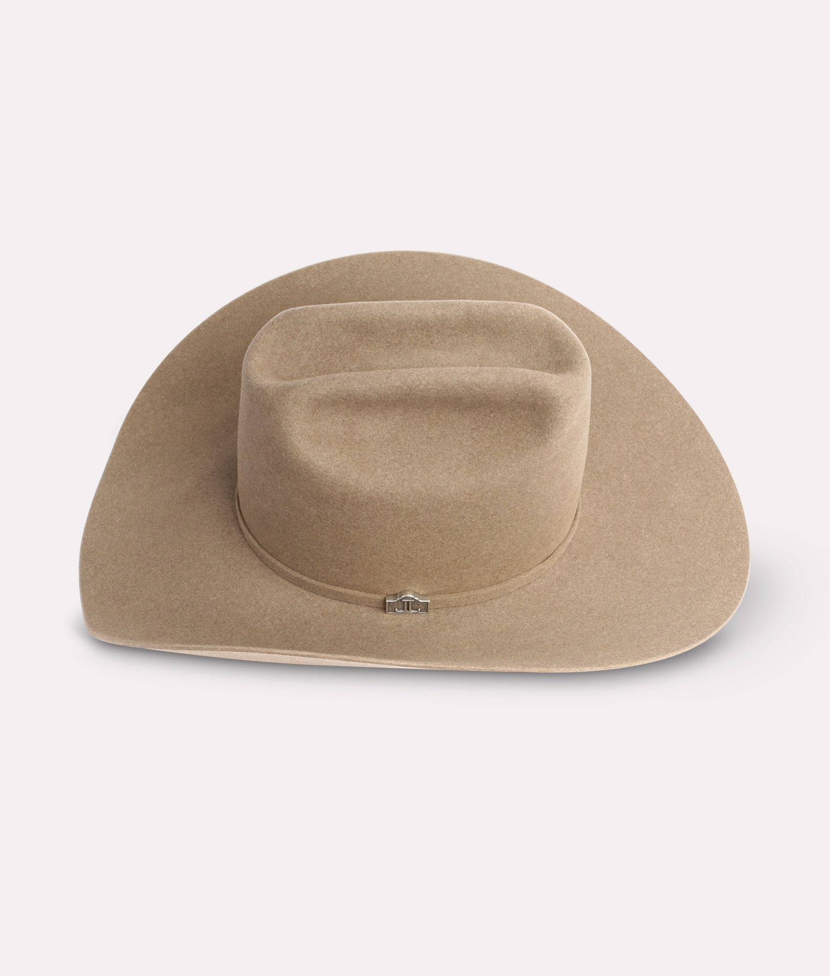 Part of our exclusive Lucchese Western hat collection. the Alamo is a hat that pays homage to the Lone Star State – inspired by the city where Lucchese Bootmaker was founded in 1883 and named after the historical landmark in Texas. The Alamo is 100% custom made and hand-shaped from a blend of the finest beaver nutria furs. A 5 ? tapered crown with a slightly modified cattleman’s crease and a 4 ? brim achieve a Western look. A self-band made from its own body are attached with a handmade hat pin styled in the shape of the Alamo with the Lucchese mirrored-L 1883 logo inside the outline. Distressed to give an aged appearance. Handmade in Texas.