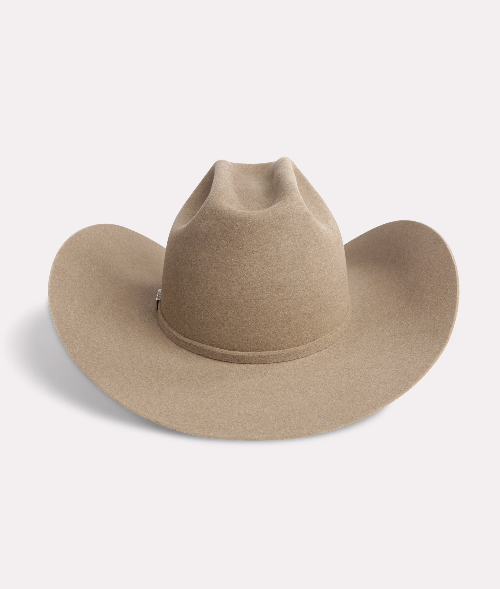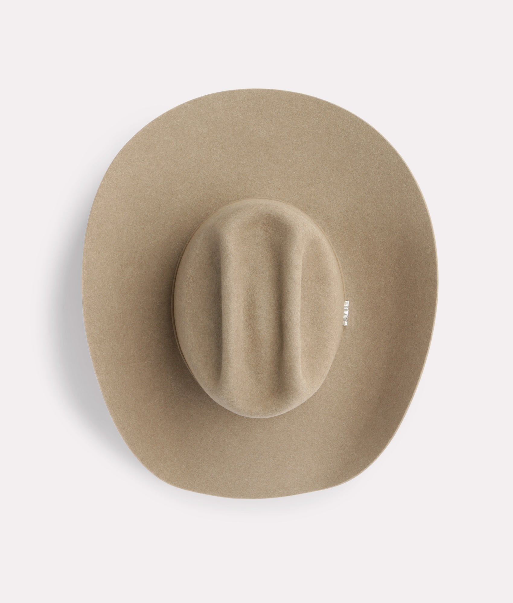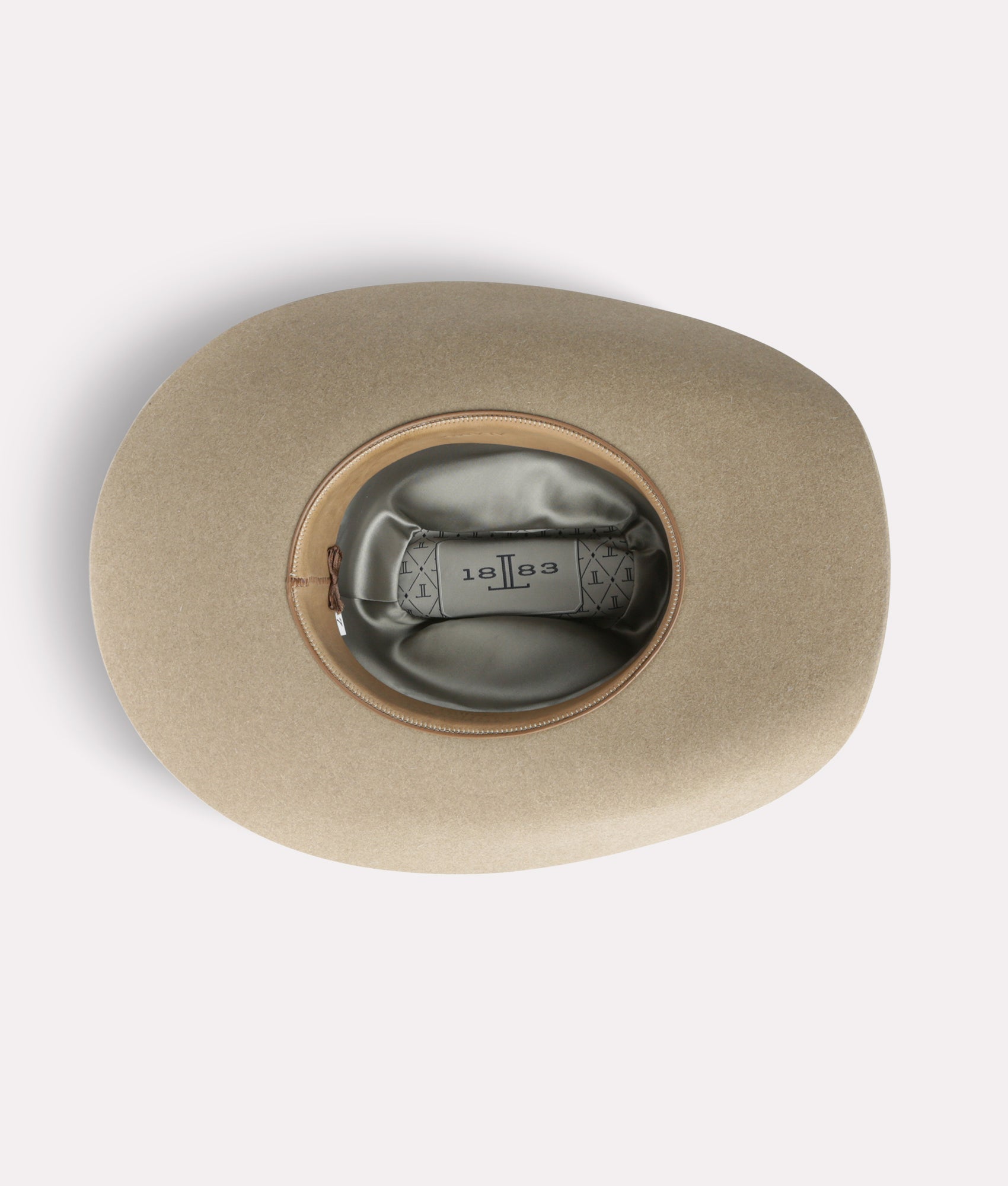 Part of our exclusive Lucchese Western hat collection. the Alamo is a hat that pays homage to the Lone Star State – inspired by the city where Lucchese Bootmaker was founded in 1883 and named after the historical landmark in Texas. The Alamo is 100% custom made and hand-shaped from a blend of the finest beaver nutria furs. A 5 ? tapered crown with a slightly modified cattleman’s crease and a 4 ? brim achieve a Western look. A self-band made from its own body are attached with a handmade hat pin styled in the shape of the Alamo with the Lucchese mirrored-L 1883 logo inside the outline. Distressed to give an aged appearance. Handmade in Texas.