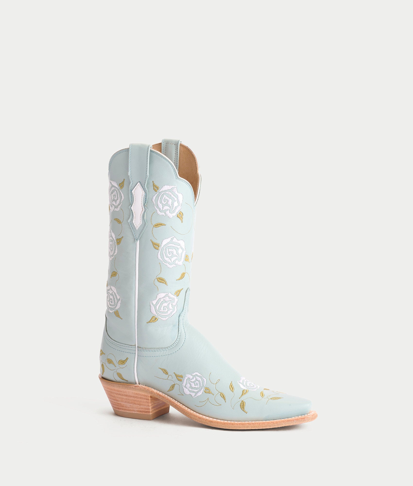 Our vision for Tilly in Bloom was to recreate a moment ?C a moment like running through a field of flowers while not actually being there. It’s not often we find ourselves in wide open spaces where the roses bloom. but this is?pretty close. The 12-inch-tall CFS Martha-stitched quarters are flanked with overlaid pull straps that allude to the thorns of a pretty rose. Cremes. pinks. and lilacs make it impossible to only feel a boot on your foot but to feel captivated by her beauty. Handmade in Texas.