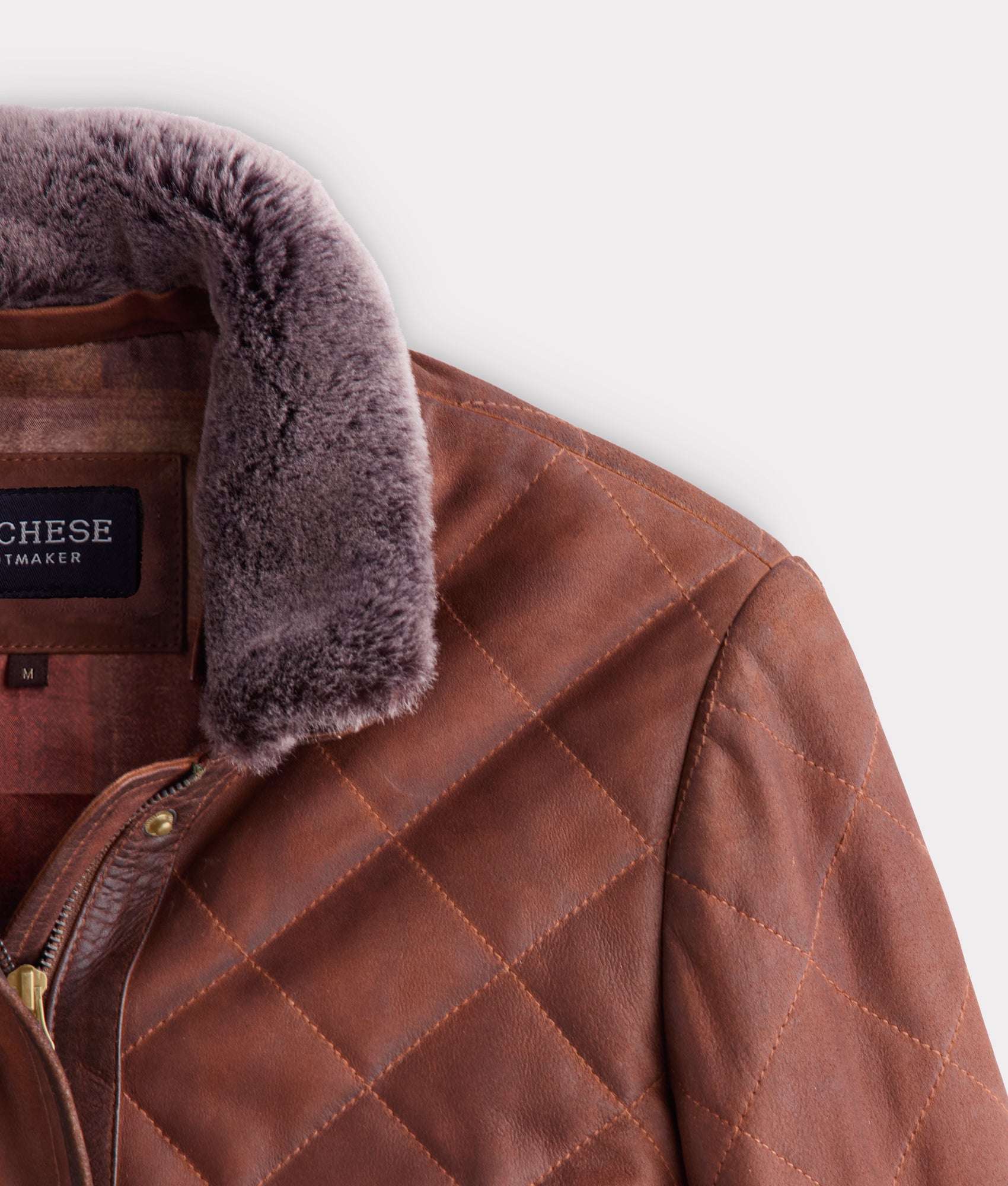 The Wasatch Quilted Leather Jacket is made from 100% premium leather with a rich. lived-in patina. The diamond quilted stitching adds structure. while the plush fur collar liner delivers serious warmth. Snap-flap pockets offer both utility and visual balance. and the high stand collar secures snugly with a leather throat latch to seal out the chill.