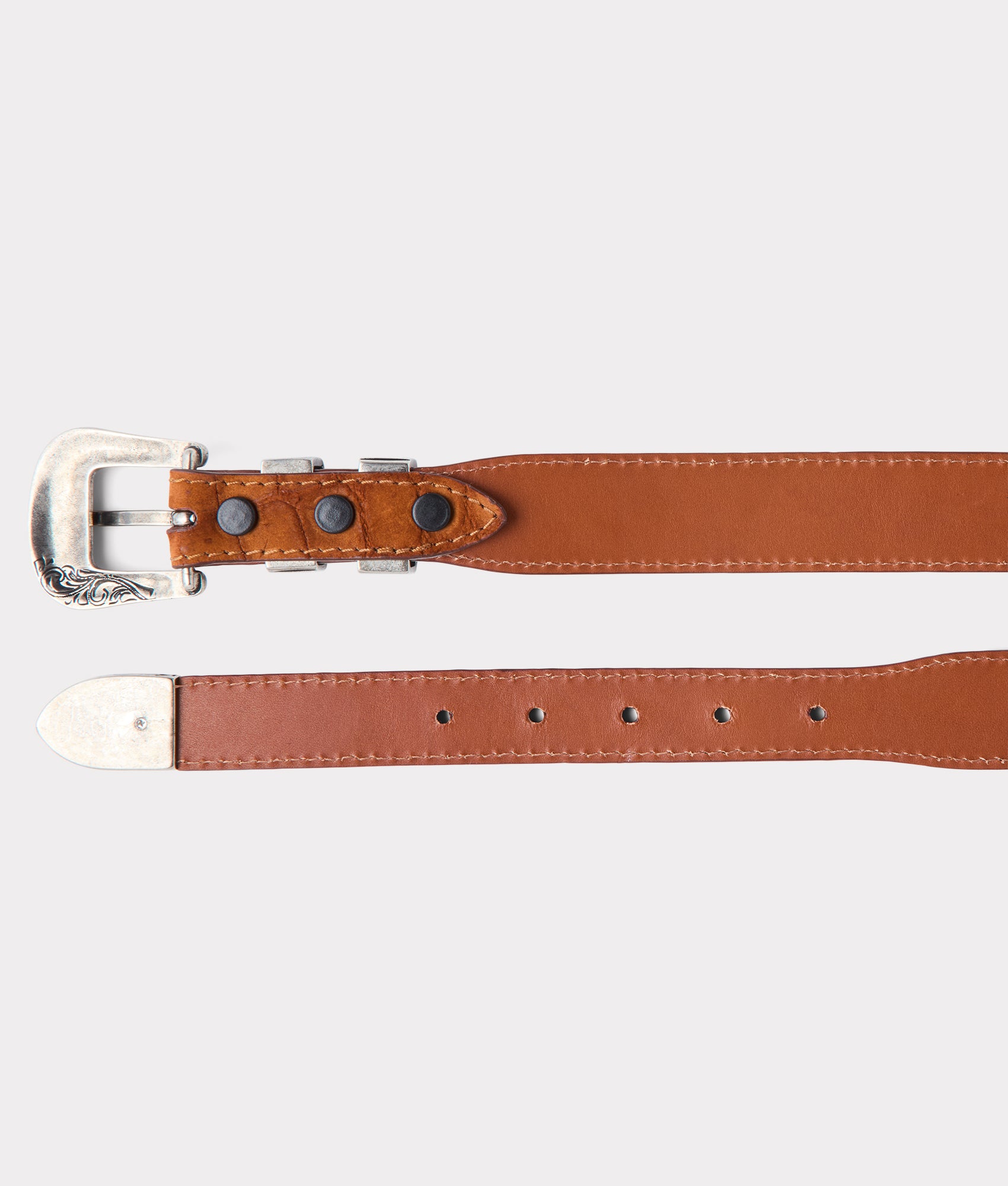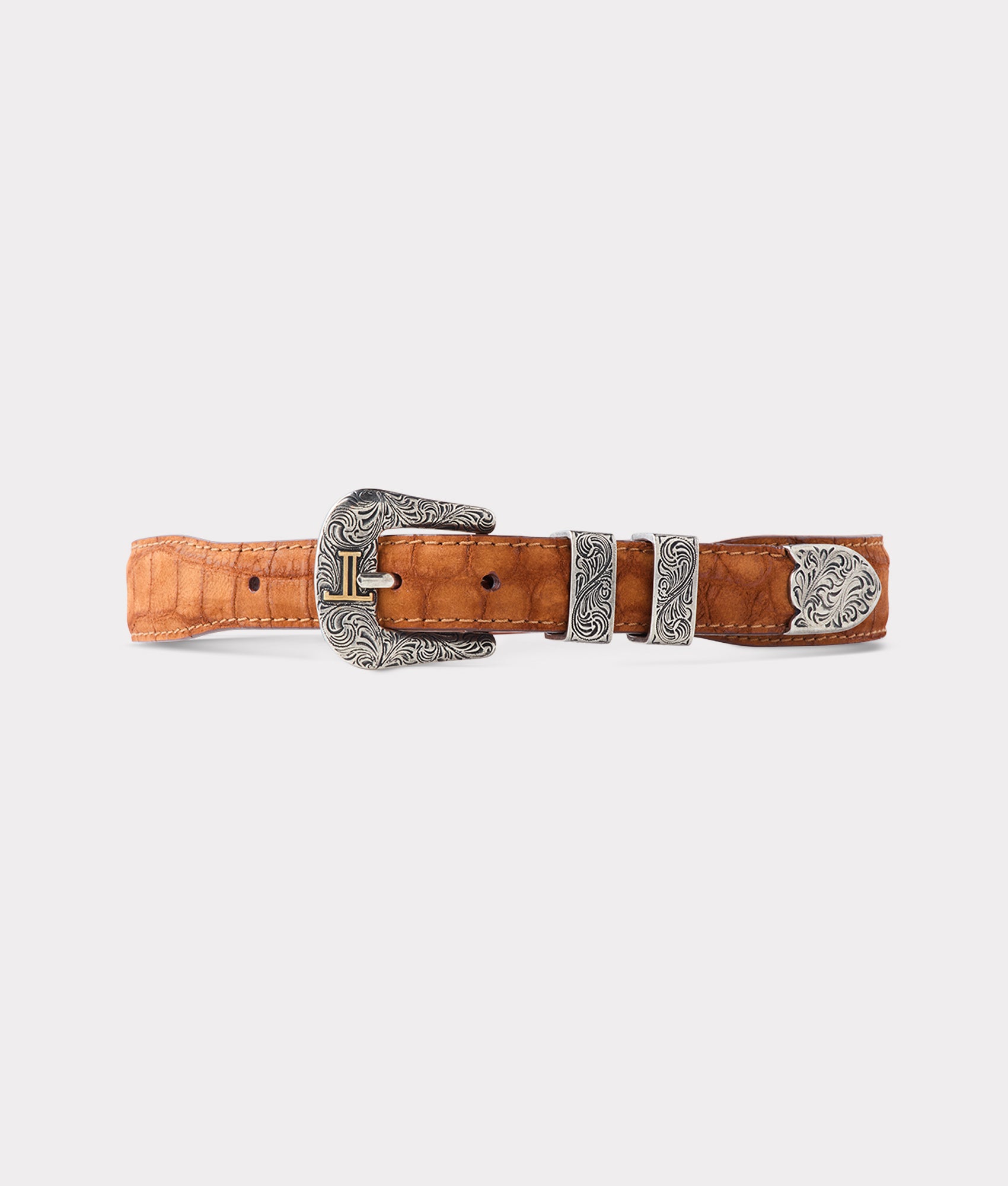 This woman’s belt is sueded caiman with a classic 4-piece nickel-plated buckle set. A silver-plated tip and a mirrored-L on the buckle add just the right amount of shine. while the strap tapers gracefully from 1.25 to 1 for a flattering. feminine silhouette. It is a versatile statement piece??equally at home with denim or dressed up. and made to move with confidence. Handmade in Texas.